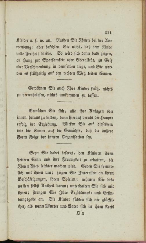 Seyn Sie dabei besorgt, den Kindern ihren heitern Sinn und ihre Freudigkeit zu erkalten, die Ihnen Alles leichter machen wird. Gehen Sie freundlich mit ihnen um; zeigen Sie Interessen an ihren Beschäftigungen, ihren Spielen; nehmen Sie bisweilen selbst Antheil daran; unterhalten Sie sich mit ihnen; strengen Sie Ihre Srzählunqs- und Erfindungsgabe an. Die Kinder fühlen sich nie glücklicher, als wenn Mutter und Vater sich in ihren Kreis