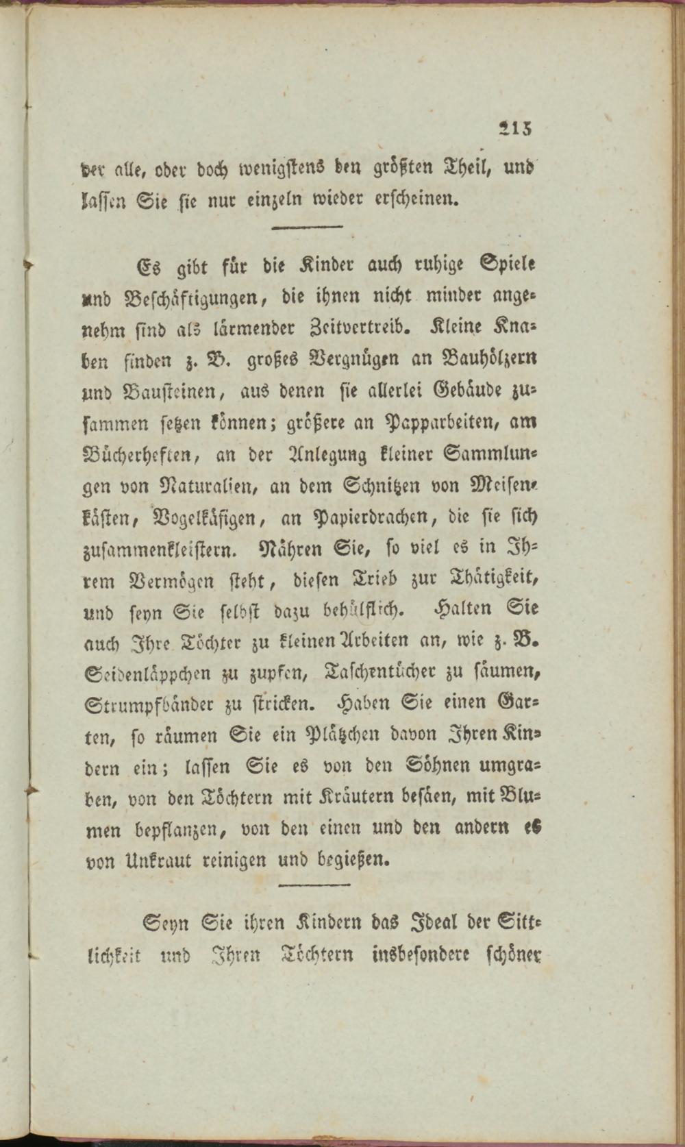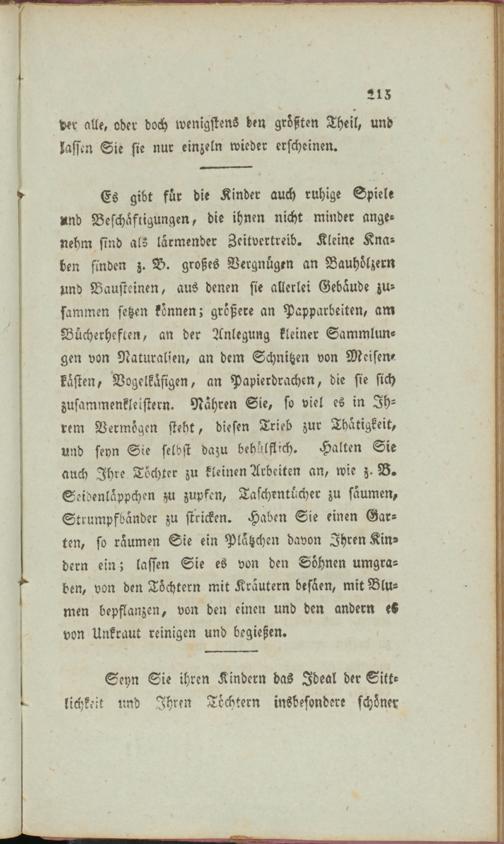 Es gibt für die Kinder auch ruhige Spiele »nd Beschäftigungen, die ihnen nicht minder angenehm sind als lärmender Zeitvertreib. Kleine Knaben finden z. D. großes Vergnügen an Bauhölzern und Bausteinen, aus denen sie allerlei Gebäude zu- sammen setzen können; größere an Papparbeiten, am Bücherheften, an der Anlegung kleiner Sammlungen von Naturalien, an dem Schnitzen von Mcisen- kästen, Vogelkäfigen, an Papierdrachcn, die sie sich zusammenkleistern. Nähren Sie, so viel es in Ihrem Vermögen steht, diesen Trieb zur Thätigkeit, und seyn Sie selbst dazu bebülflrch. Halten Sie auch Ihre Töchter zu kleinen Arbeiten an, wie z. B. Seidenläppchen zu zupfen, Taschentücher zu säumen, Strumpfbänder zu stricken. Haben Sie einen Garten, so räumen Sie ein Plätzchen davon Ihren Kindern ein; lassen Sie es von den Söhnen umgraben, von den Töchtern mit Krautern besäen, mit Blumen bepflanzen, von den einen und den andern r- von Unkraut reinigen und begießen.