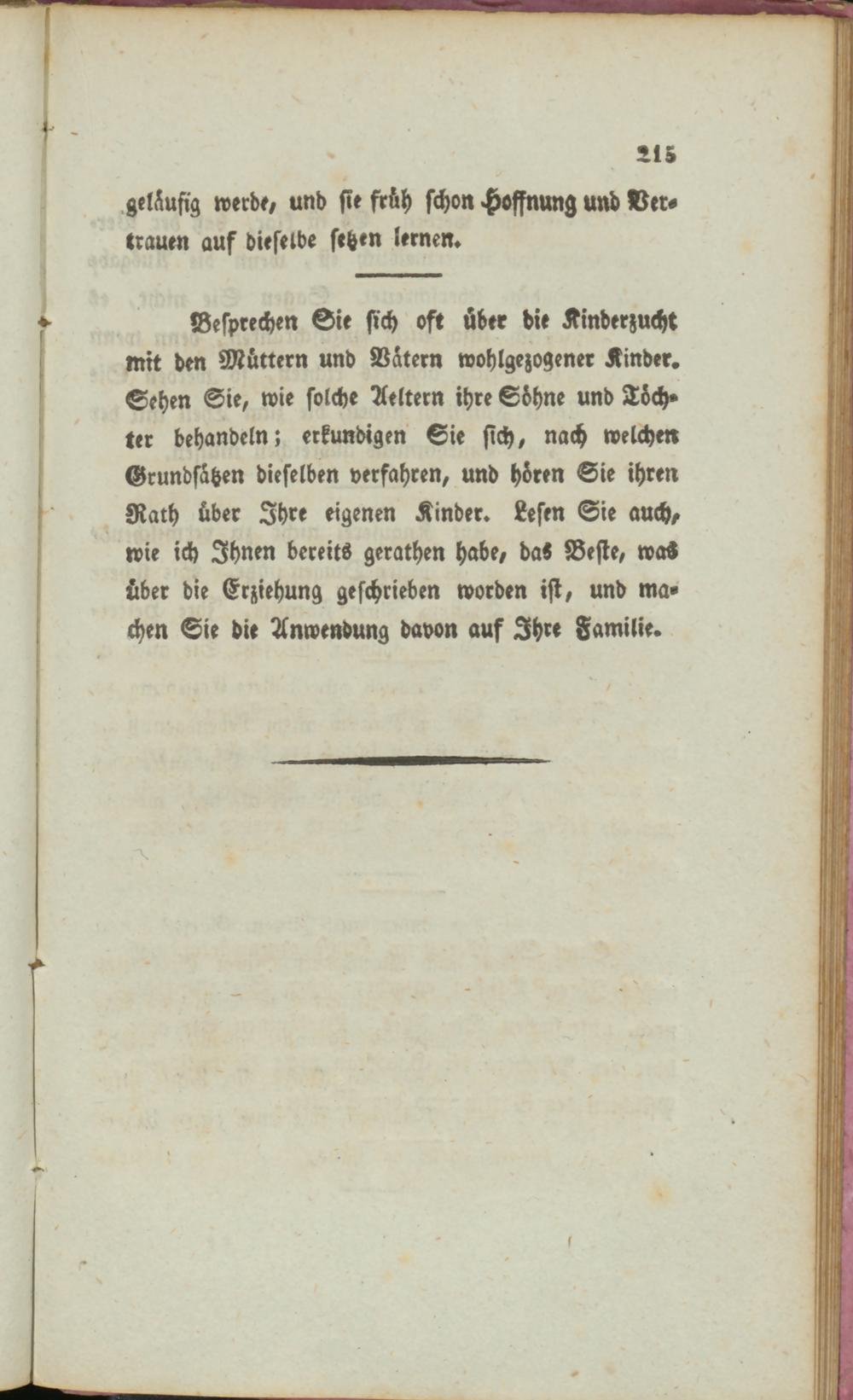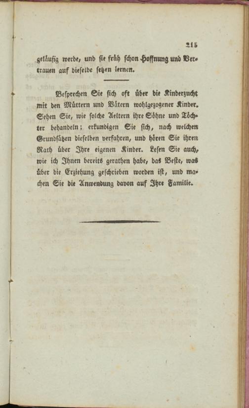 Besprechen Sie sich oft über die Rinderzucht mit den Müttern und Vätern wohlgezogener Kinder. Sehen Sie, wie solche Aeltern ihre Söhne und Töch- ter behandeln; erkundigen Sie sich, nach welchen Grundsätzen dieselben verfahren, und hören Sie ihren Rath über Ihre eigenen Kinder. Lesen Sie auch, wie ich Ihnen bereits gerathen habe, daS Beste, wa- über die Erziehung geschrieben worden ist, und machen Sie die Anwendung davon auf Ihre Familie.