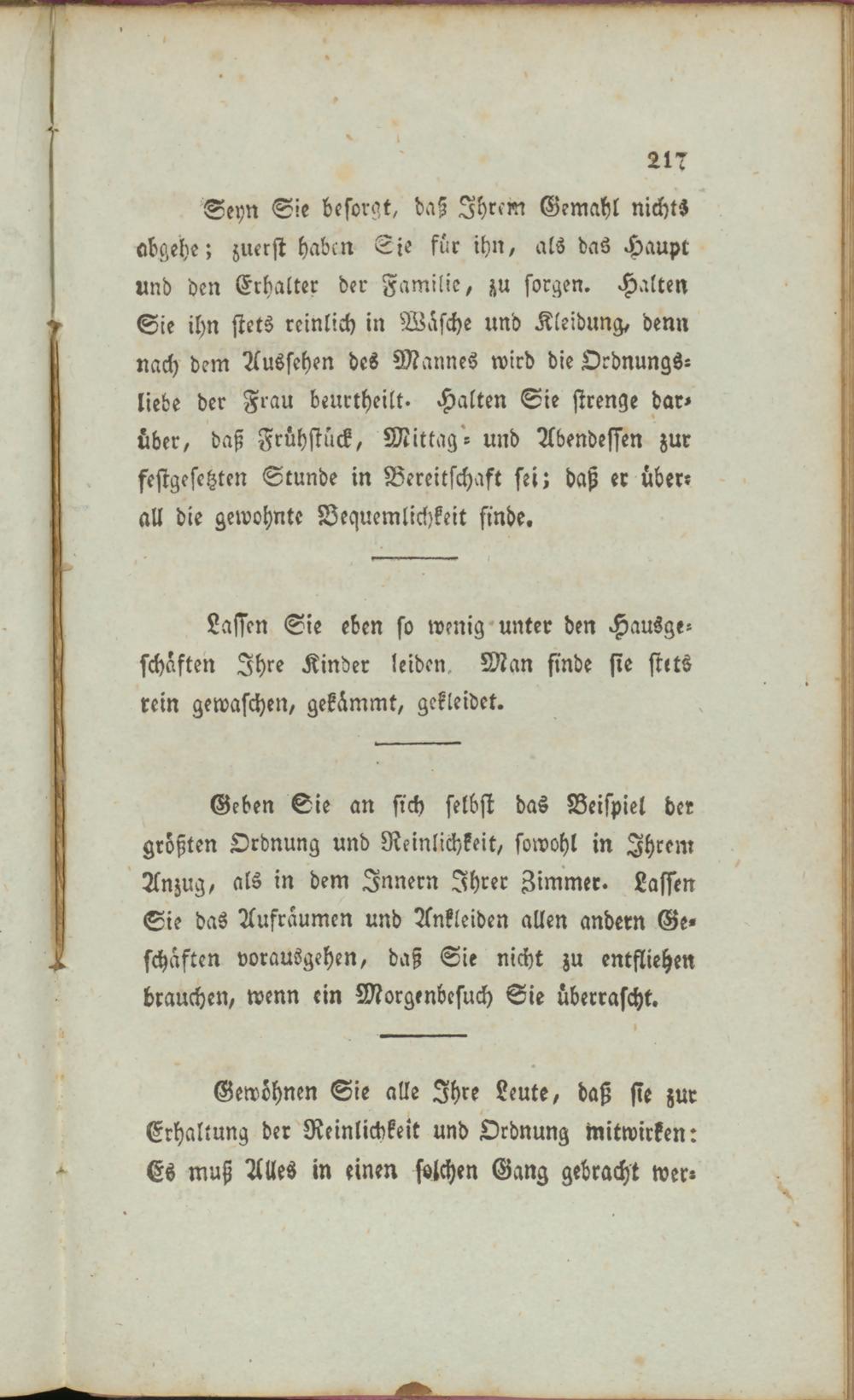 Geben Sie an sich selbst das Beispiel der größten Ordnung und Reinlichkeit, sowohl in Ihrem Anzug, als in dem Innern Ihrer Zimmer. Lassen Sie das Aufräumen und Ankleiden allen andern Ge- schaften vorausgehen, daß Sie nicht zu entfliehen brauchen, wenn ein Morgenbesuch Sie überrascht.