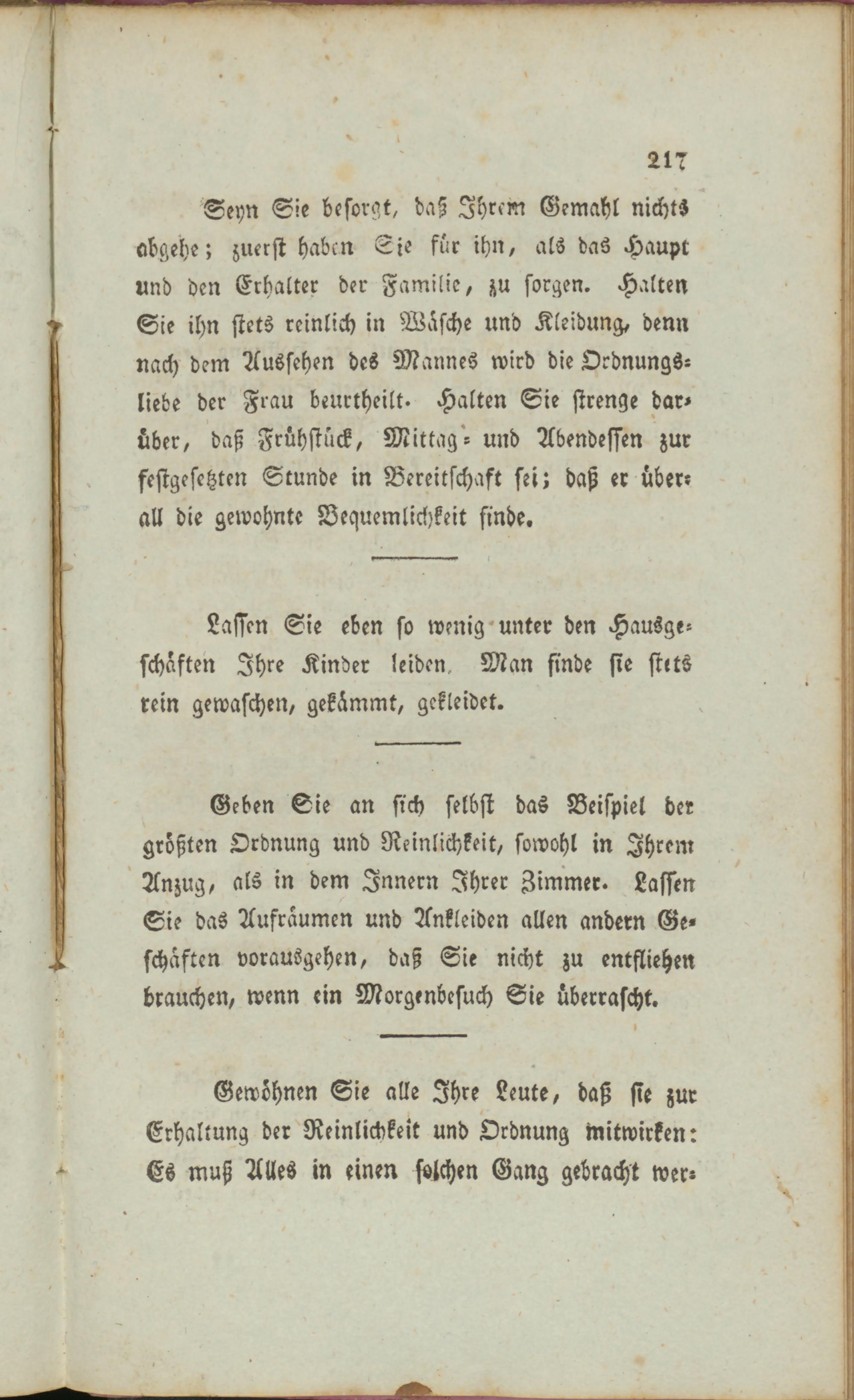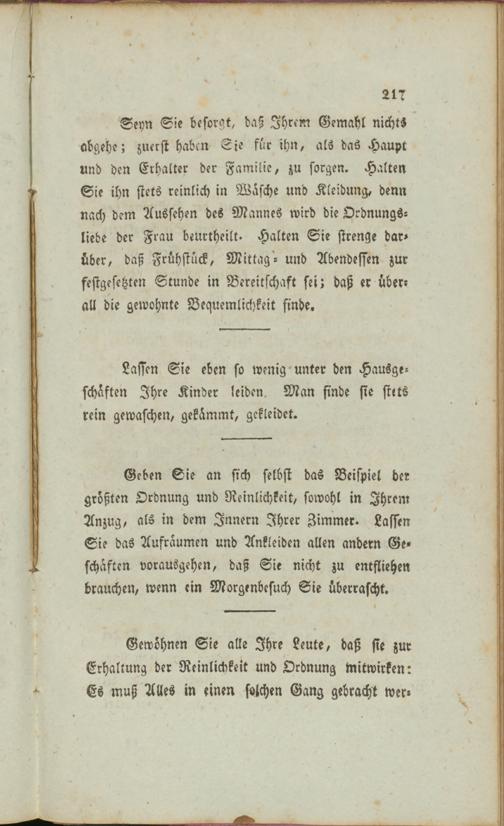 Seyn Sie besorgt, daß Ihrem Gemahl nichts abgehe; zuerst haben Sie für ihn, als das Haupt und den Erhalter der Familie, zu sorgen. Halten Sie ihn stets reinlich in Wasche und Kleidung, denn nach dem Aussehen des Mannes wird die Ordnungsliebe der Frau beurtheilt- Halten Sie strenge darüber, daß Frühstück, Mittag- und Abendessen zur festgesetzten Stunde in Bereitschaft sei; daß er überall die gewohnte Bequemlichkeit finde.