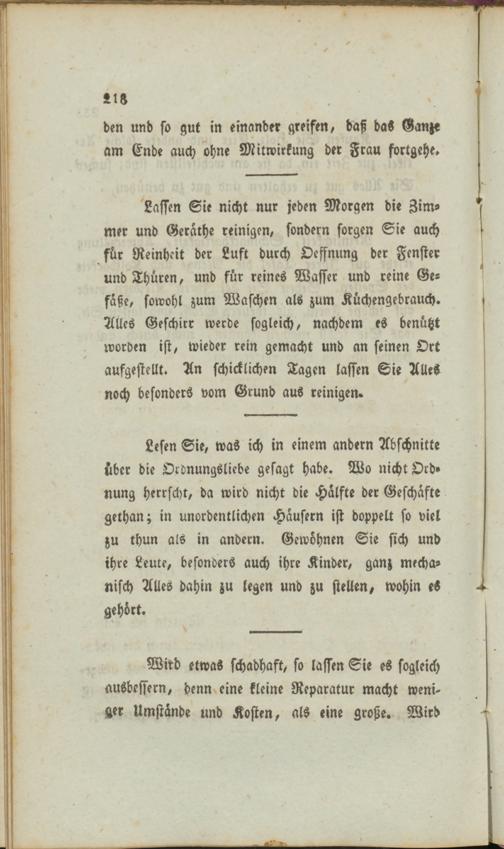 Lassen Sie nicht nur jeden Morgen die Zimmer und Geräthe reinigen, sondern sorgen Sie auch für Reinheit der Luft durch Oeffnung der Fenster und Thüren, und für reines Wasser und reine Gefäße, sowohl zum Waschen als zum Küchengebrauch. Alles Geschirr werde sogleich, nachdem es benützt worden ist, wieder rein gemacht und an seinen Ort aufgestellt. An schicklichen Tagen lassen Sie Alles noch besonders vom Grund aus reinigen.