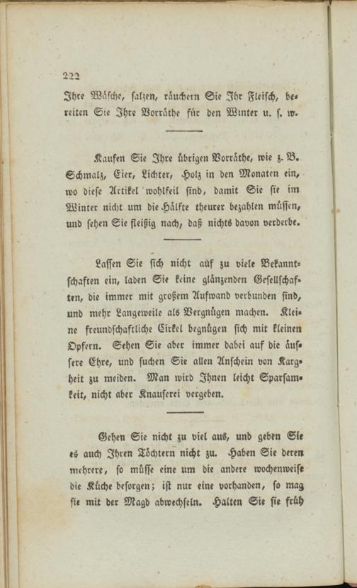 Lassen Sie sich nicht aüf zu viele Bekanntschaften ein, laden Sie keine glänzenden Gesellschaften, die immer mit großem Aufwand verbunden sind, und mehr Langeweile als Vergnügen machen. Klei- ne freundschaftliche Eirkel begnügen sich mit kleinen Opfern. Sehen Sie aber immer dabei auf die äussere Ehre, und suchen Sie allen Anschein von Kargheit zu meiden. Man wird Ihnen leicht Sparsamkeit, nicht aber Knauserei vergeben.