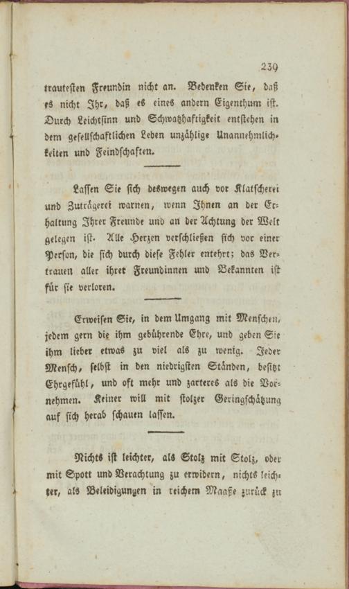 trautesten Freundin nicht an. Bedenken Sie, daß es nicht Ihr, daß es eines andern Eigenthum ist. Durch Leichtsinn und Schwatzhafrigkeit entstehen in dem gesellschaftlichen Leben unzählige Unannehmlich. keilen und Feindschaften.