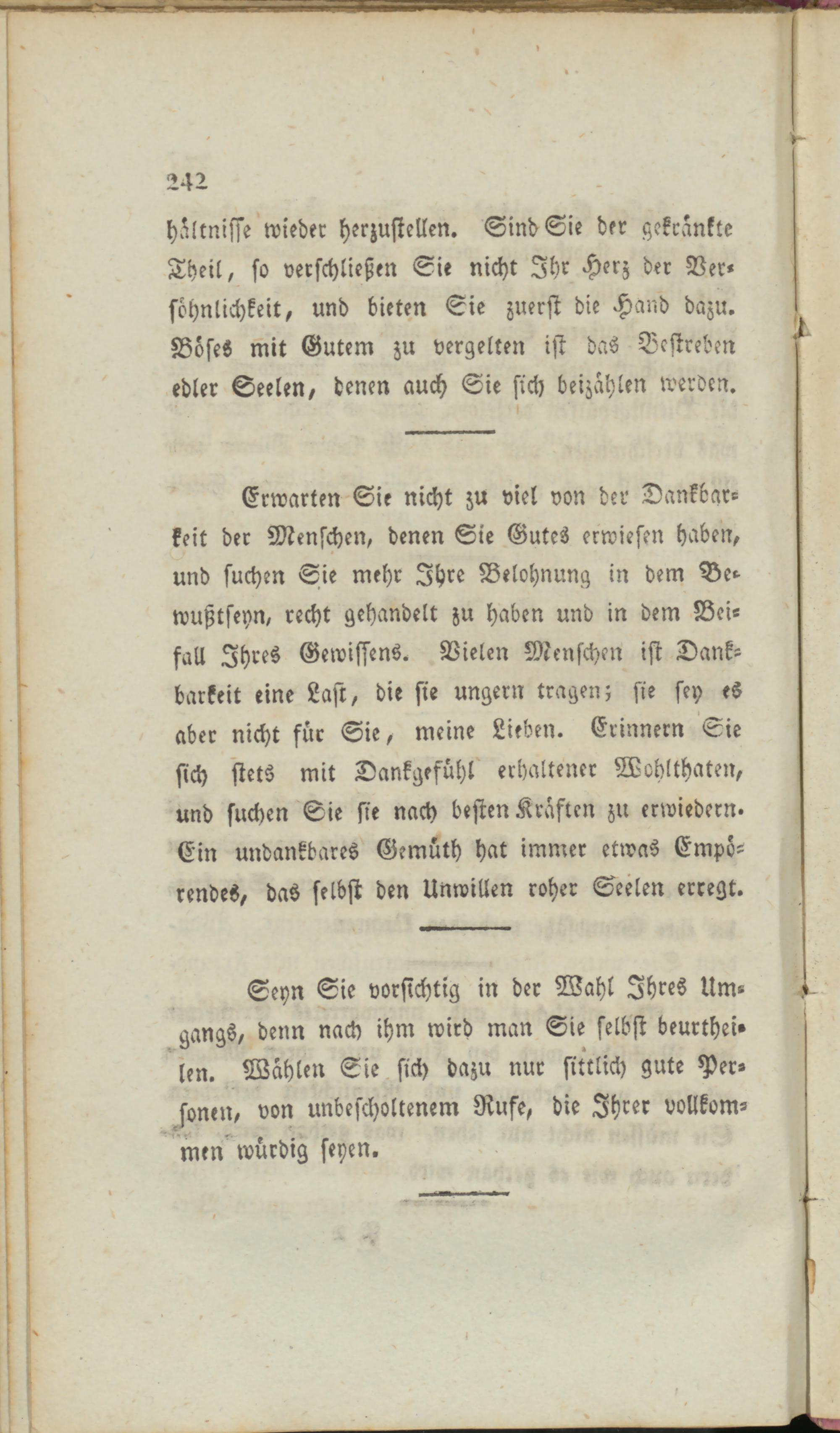 Erwarten Sie nicht zu viel von der Dankbarkeit der Menschen, denen Sie Gutes erwiesen haben, und suchen Sie mehr Ihre Belohnung in dem Bewußtseyn, recht gehandelt zu haben und in dem Beifall Ihres Gewissens. Vielen Menschen ist Dankbarkeit eine Last, die sie ungern tragen; sie sey es aber nicht für Sie, meine Lieben. Erinnern Sie sich stets mit Dankgefühl erhaltener Wohlthaten, und suchen Sie sie nach besten Kräften zu erwiedern. Ein undankbares Gemüth hat immer etwas Empörendes, das selbst den Unwillen roher Seelen erregt.