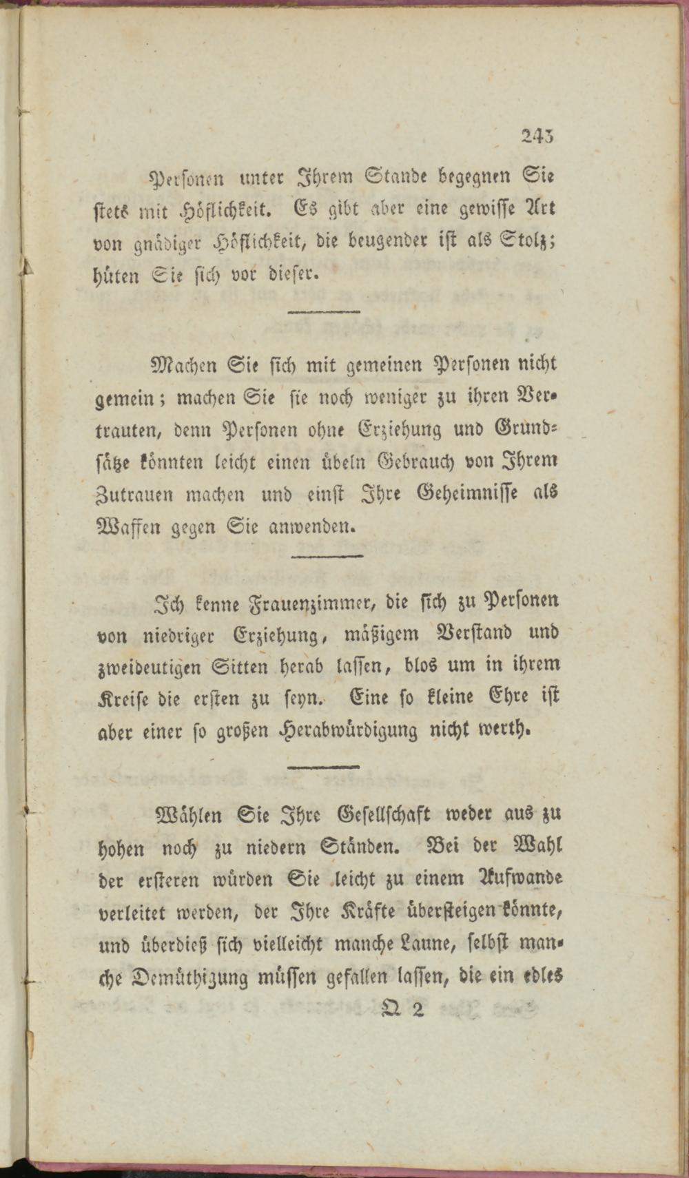 Machen Sie sich mit gemeinen Personen nicht gemein; machen Sie sie noch weniger zu ihren Ver» trauten, denn Personen ohne Erziehung und Grundsätze könnten leicht einen Übeln Gebrauch von Ihrem Zutrauen machen und einst Ihre Geheimnisse als Waffen gegen Sie anwenden.
