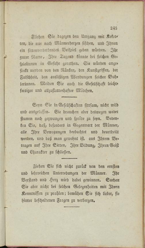 Seyn Sie in Gesellschaften sittsam, nicht wild und ausgelassen. Sie brauchen aber deswegen weder stumm noch gezwungen und spröde zu seyn. Bedenken Sie, daß, besonders in Gegenwart der Männer, alle Ihre Bewegungen beobachtet und beurtheilt werden, und daß man gewohnt ist, aus Ihrem Betragen auf Ihre Sitten, Ihre Bildung, Ihren Geist und Charakter zu schließen.