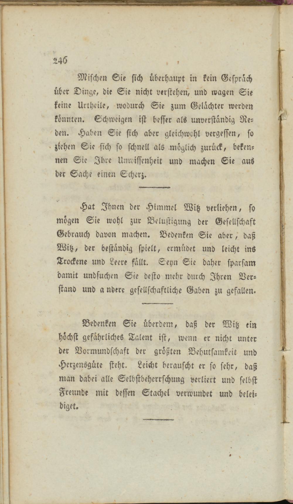 Hat Ihnen der Himmel Witz verliehen, so mögen Sie wohl zur Belustigung der Gesellschaft Gebrauch davon machen. Bedenken Sie aber,' daß Witz, der beständig spielt, ermüdet und leicht ins Trockene und Leere fallt. Seyn Sie daher sparsam damit undsuchen Sie desto mehr durch Ihren Verstand und andere gesellschaftliche Gaben zu gefallen.