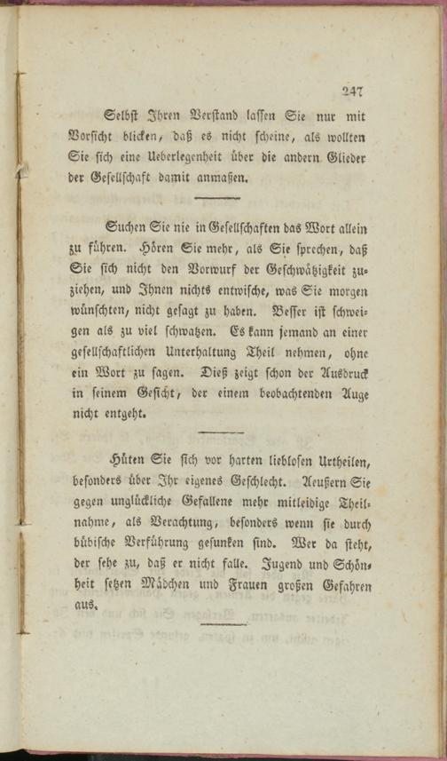 Suchen Sie nie in Gesellschaften das Wort allein zu führen. Hören Sie mehr, als Sie sprechen, daß Sie sich nicht den Vorwurf der Geschwätzigkeit zuziehen, und Ihnen nichts entwische, was Sie morgen wünschten, nicht gesagt zu haben. Besser ist schweigen als zu viel schwatzen. Es kann jemand an einer gesellschaftlichen Unterhaltung Theil nehmen, ohne ein Wort zu sagen. Dieß zeigt schon der Ausdruck in seinem Gesicht, der einem beobachtenden Auge nicht entgeht.