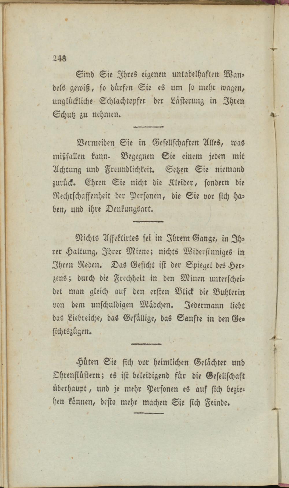 Nichts Affektirtes sei in Ihrem Gange, in Ihrer Haltung, Ihrer Miene; nichts Widersinniges in Ihren Reden. Das Gesicht ist der Spiegel des Herzens; durch die Frechheit in den Minen unterscheidet man gleich auf den ersten Blick die Buhlecin von dem unschuldigen Mädchen. Jedermann liebt das Liebreiche, das Gefällige, das Sanfte in den Gesichtszügen.