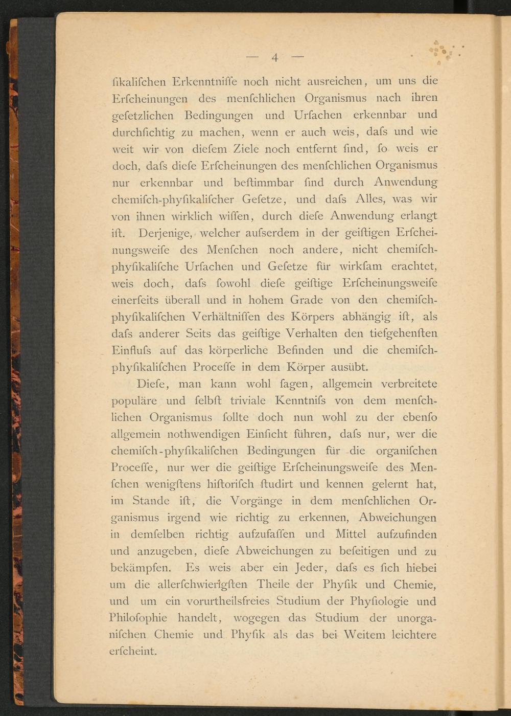 fikalifchen Erkenntniffe noch nicht ausreichen, um uns die Erfcheinungen des menschlichen Organismus nach ihren gefetzlichen Bedingungen und Urfachen erkennbar und durchfichtig zu machen, wenn er auch weis, dafs und wie weit wir von diefem Ziele noch entfernt find, fo weis er doch, dafs diefe Erfcheinungen des menfchlichen Organismus nur erkennbar und beftimmbar find durch Anwendung chemifch-phyfikalifcher Gefetze, und dafs Alles, was wir von ihnen wirklich wiffen, durch diefe Anwendung erlangt ift. Derjenige, welcher aufserdem in der geiftigen Erfchei- nungsweife des Menfchen noch andere, nicht chemifch- phyfikalifche Urfachen und Gefetze für wirkfam erachtet, weis doch, dafs fowohl diefe geiftige Erfcheinungsweife einerfeits überall und in hohem Grade von den chemifch- phyfikalifchen Verhältniffen des Körpers abhängig ift, als dafs anderer Scits das geiftige Verhalten den tiefgehenften Einflufs auf das körperliche Befinden und die chemifch- phyfikalifchen Proceffe in dem Körper ausübt.