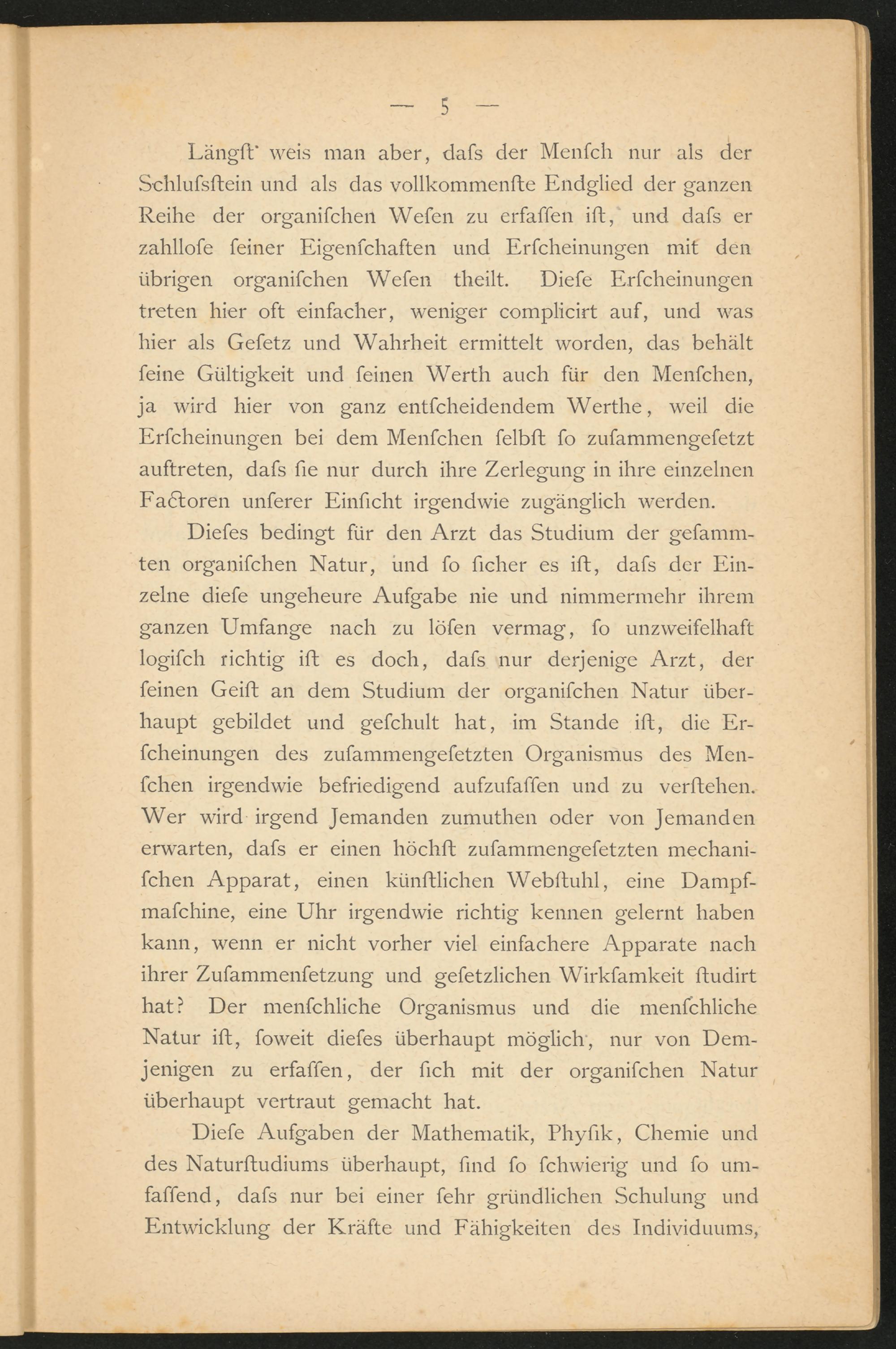 Diefes bedingt für den Arzt das Studium der gefamm- ten organifchen Natur, und fo ficher es ift, dafs der Einzelne diefe ungeheure Aufgabe nie und nimmermehr ihrem ganzen Umfange nach zu löfen vermag, fo unzweifelhaft logifch richtig ift es doch, dafs nur derjenige Arzt, der feinen Geift an dem Studium der organifchen Natur überhaupt gebildet und gefchult hat, im Stande ift, die Erfcheinungen des zufammengefetzten Organismus des Menfchen irgendwie befriedigend aufzufaffen und zu verliehen. Wer wird irgend Jemanden zumuthen oder von Jemanden erwarten, dafs er einen höchft zufammengefetzten mechani- fchen Apparat, einen künftlichen Webftuhl, eine Dampf- mafchine, eine Uhr irgendwie richtig kennen gelernt haben kann, wenn er nicht vorher viel einfachere Apparate nach ihrer Zufammenfetzung und gefetzlichen Wirkfamkeit ftudirt hat? Der menfchliche Organismus und die menfchliche Natur ift, foweit diefes überhaupt möglich, nur von Demjenigen zu erfaffen, der fich mit der organifchen Natur überhaupt vertraut gemacht hat.
