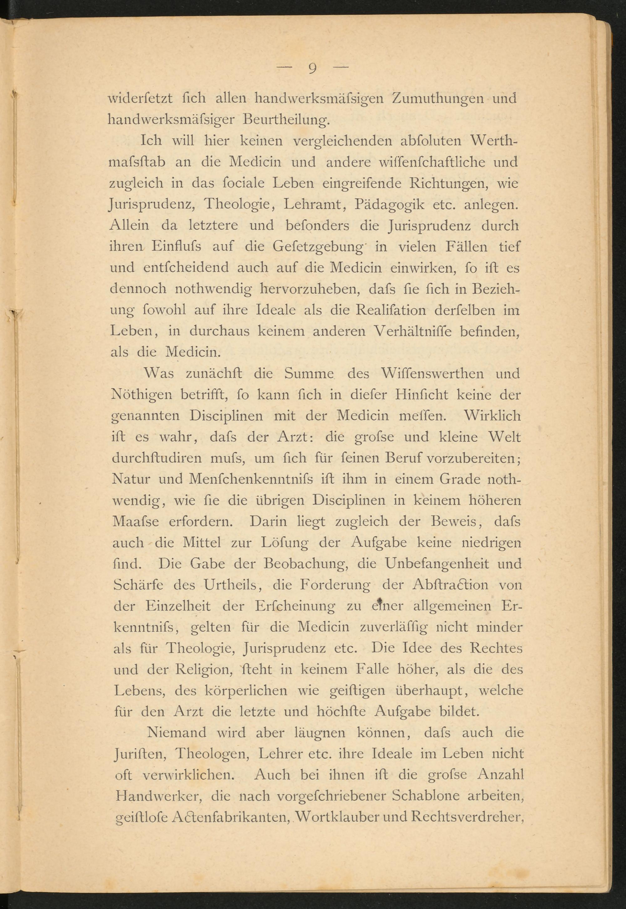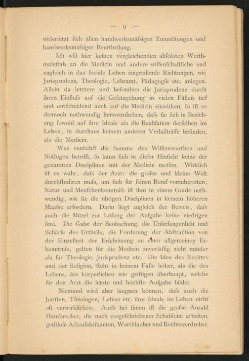 Ich will hier keinen vergleichenden abfoluten Werth- mafsftab an die Medicin und andere wiffenfchaftliche und zugleich in das fociale Leben eingreifende Richtungen, wie Jurisprudenz, Theologie, Lehramt, Pädagogik etc. anlegen. Allein da letztere und befonders die Jurisprudenz durch ihren Einflufs auf die Gefetzgebung' in vielen Fällen tief und entfcheidend auch auf die Medicin einwirken, fo ift es dennoch nothwendig hervorzuheben, dafs fie fich in Beziehung fowohl auf ihre Ideale als die Realifation derfelben im Leben, in durchaus keinem anderen Verhältniffe befinden, als die Medicin.
