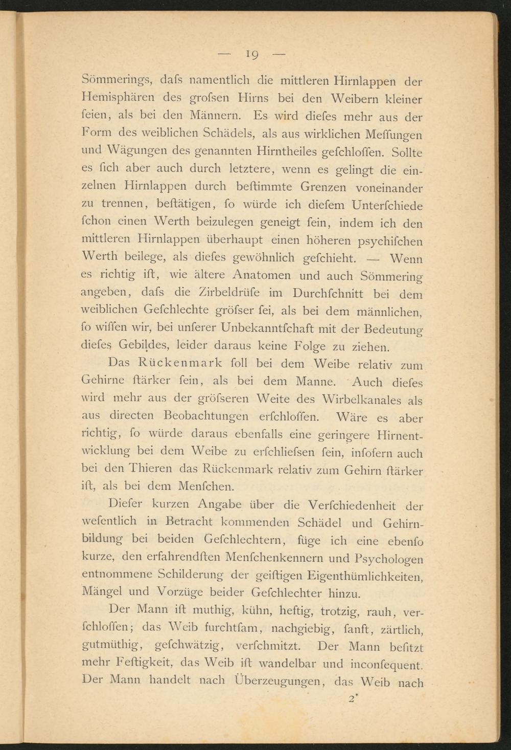 Diefer kurzen Angabe über die Verfchiedenheit der wefentlich in Betracht kommenden Schädel und Gehirnbildung bei beiden Gefchlechtern, füge ich eine ebenfo kurze, den erfahrendften Menfchenkennern und Psychologen entnommene Schilderung der geiftigen Eigenthümlichkeiten, Mängel und Vorzüge beider Gefchlechter hinzu.