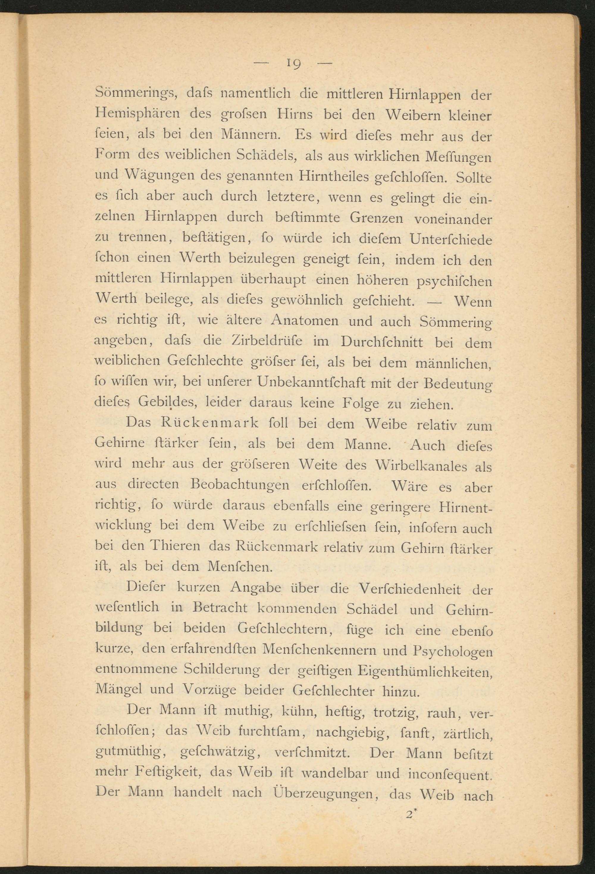 Sömmerings, dafs namentlich die mittleren Hirnlappen der Hemisphären des grofsen Hirns bei den Weibern kleiner feien, als bei den Männern. Es wird diefes mehr aus der Form des weiblichen Schädels, als aus wirklichen Meffungen und Wägungen des genannten Hirntheiles gefchloffen. Sollte es fich aber auch durch letztere, wenn es gelingt die einzelnen Hirnlappen durch beftimmte Grenzen voneinander zu trennen, beftätigen, fo würde ich diefem Unterfchiede fchon einen Werth beizulegen geneigt fein, indem ich den mittleren Hirnlappen überhaupt einen höheren psychifchen Werth beilege, als diefes gewöhnlich gefchieht. — Wenn es richtig ift, wie ältere Anatomen und auch Sömmering angeben, dafs die Zirbeldrüfe im Durchfchnitt bei dem weiblichen Gefchlechte gröfser fei, als bei dem männlichen, fo wiflen wir, bei unferer Unbekanntfchaft mit der Bedeutung diefes Gebildes, leider daraus keine Folge zu ziehen.