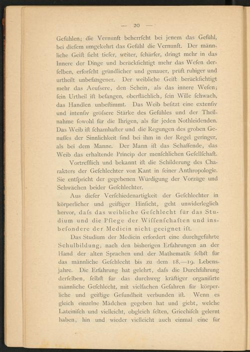 Aus diefer Verfchiedenartigkeit der Gefchlechter in körperlicher und geiftiger Hinficht, geht unwiderleglich hervor, dafs das weibliche Gefchlecht für das Studium und die Pflege der Wiffenfchaften und ins- befondere der Medicin nicht geeignet ift.