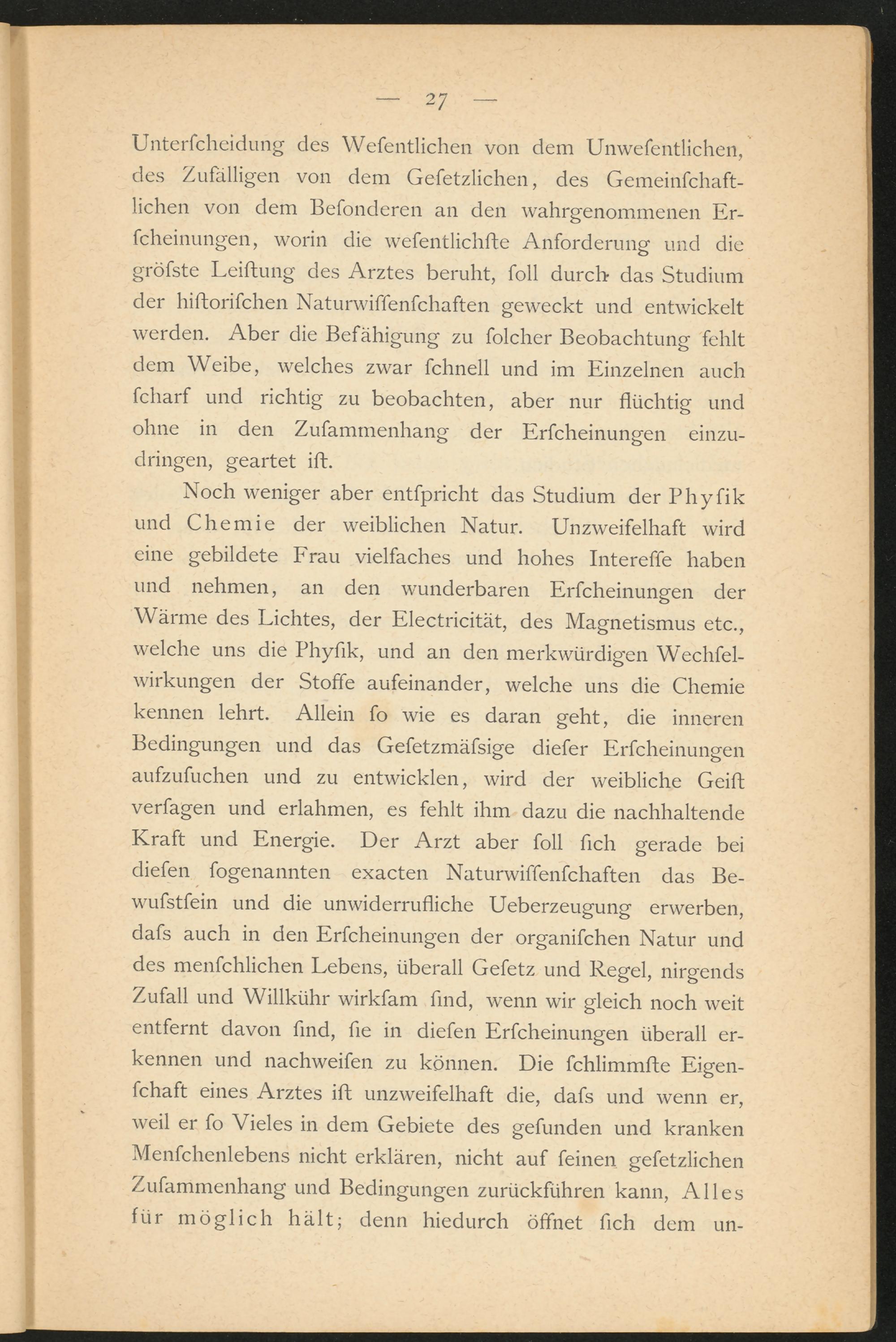 Unterfcheidung des Wefentlichen von dem Unwefentlichen, des Zufälligen von dem Gefetzlichen, des Gemeinfchaft- lichen von dem Befonderen an den wahrgenommenen Er- fcheinungen, worin die wefentlichfte Anforderung und die gröfste Leiftung des Arztes beruht, foll durch das Studium der hiftorifchen Naturwiffenfchaften geweckt und entwickelt werden. Aber die Befähigung zu folcher Beobachtung fehlt dem Weibe, welches zwar fchnell und im Einzelnen auch fcharf und richtig zu beobachten, aber nur flüchtig und ohne in den Zufammenhang der Erfcheinungen einzudringen, geartet ift.