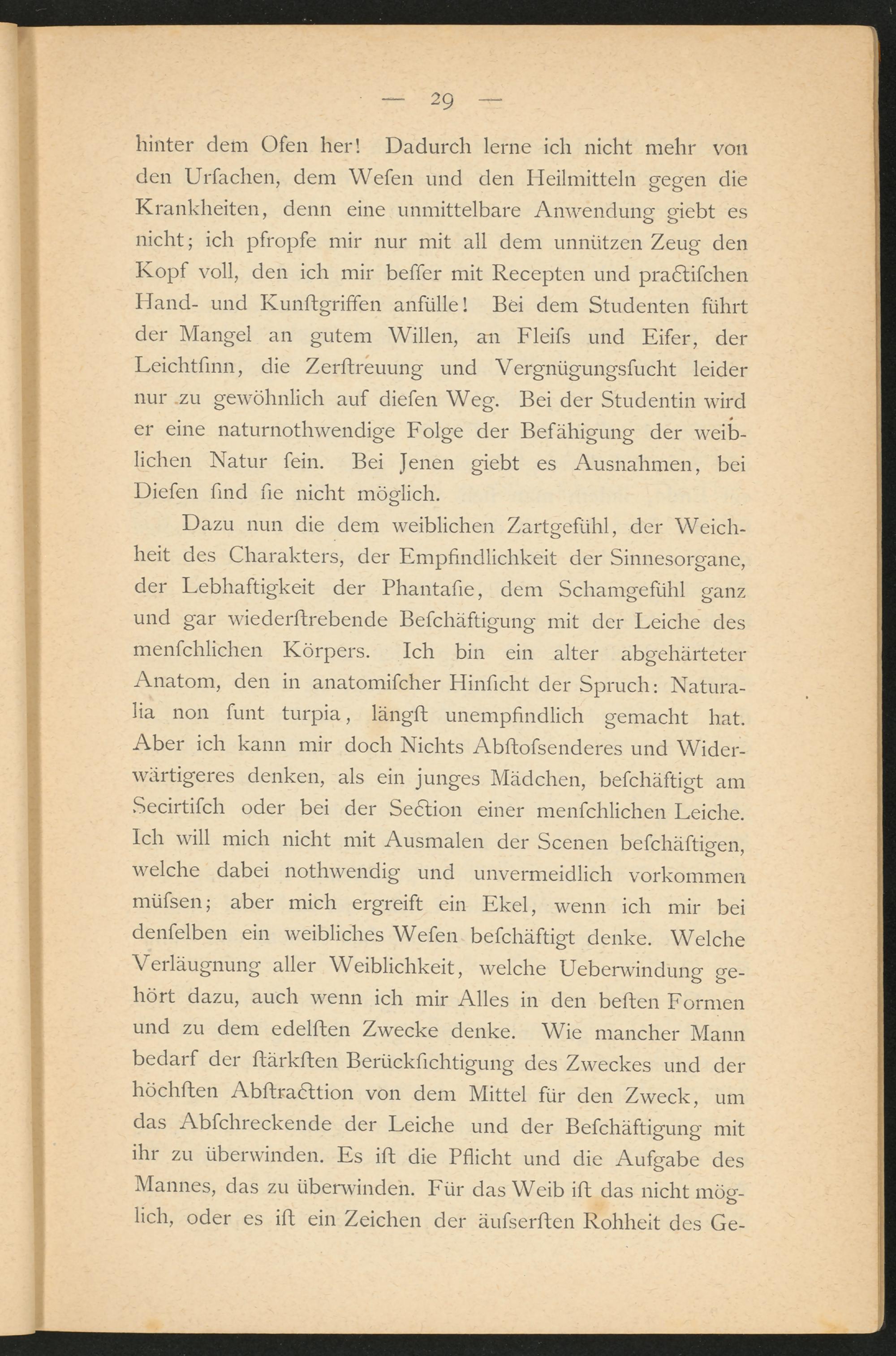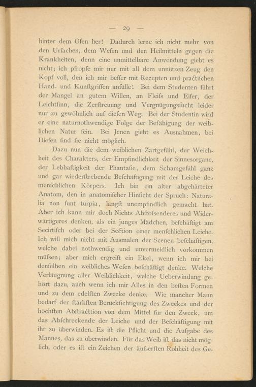 Dazu nun die dem weiblichen Zartgefühl, der Weichheit des Charakters, der Empfindlichkeit der Sinnesorgane, der Lebhaftigkeit der Phantafie, dem Schamgefühl ganz und gar wiederftrebende Befchäftigung mit der Leiche des menfchlichen Körpers. Ich bin ein alter abgehärteter Anatom, den in anatomifcher Hinficht der Spruch: Natura- lia non funt turpia, längft unempfindlich gemacht hat. Aber ich kann mir doch Nichts Abftofsenderes und Widerwärtigeres denken, als ein junges Mädchen, befchäftigt am Secirtifch oder bei der Sektion einer menfchlichen Leiche. Ich will mich nicht mit Ausmalen der Scenen befchäftigen, welche dabei nothwendig und unvermeidlich Vorkommen müfsen; aber mich ergreift ein Ekel, wenn ich mir bei denfelben ein weibliches Wefen befchäftigt denke. Welche Verläugnung aller Weiblichkeit, welche Ueberwindung gehört dazu, auch wenn ich mir Alles in den beften Formen und zu dem edelften Zwecke denke. Wie mancher Mann bedarf der ftärkften Berückfichtigung des Zweckes und der höchften Abftradltion von dem Mittel für den Zweck, um das Abfchreckende der Leiche und der Befchäftigung mit ihr zu überwinden. Es ift die Pflicht und die Aufgabe des Mannes, das zu überwinden. Für das Weib ift das nicht möglich, oder es ift ein Zeichen der äufserften Rohheit des Ge-