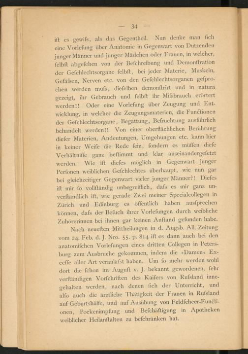 ift es gewifs, als das Gegentheil. Nun denke man ficli eine Vorlefung über Anatomie in Gegenwart von Dutzenden junger Männer und junger Mädchen oder Frauen, in welcher, felbft abgesehen von der Befchreibung und Demonftration der Gefchlechtsorgane felbft, bei jeder Materie, Muskeln, Gefäfsen, Nerven etc. von den Gefchlechtsorganen gefpro- chen werden mufs, diefelben demonftrirt und in natura gezeigt, ihr Gebrauch und felbft ihr Mifsbrauch erörtert werden!! Oder eine Vorlefung über Zeugung und Entwicklung, in welcher die Zeugungsmaterien, die Funktionen der Gefchlechtsorgane, Begattung, Befruchtung ausführlich behandelt werden!! Von einer oberflächlichen Berührung diefer Materien, Andeutungen, Umgehungen etc. kann hier in keiner Weife die Rede fein, fondern es müffen diefe Verhältniffe ganz beftimmt und klar auseinandergefetzt werden. Wie ift diefes möglich in Gegenwart junger Perfonen weiblichen Gefchlechtes überhaupt, wie nun gar bei gleichzeitiger Gegenwart vieler junger Männer?! Diefes ift mir fo vollftändig unbegreiflich, dafs es mir ganz un- verftändlich ift, wie gerade Zwei meiner Specialcollegen in Zürich und Edinburg es öffentlich haben ausfprechen können, dafs der Befuch ihrer Vorlefungen durch weibliche Zuhörerinnen bei ihnen gar keinen Anftand gefunden habe.