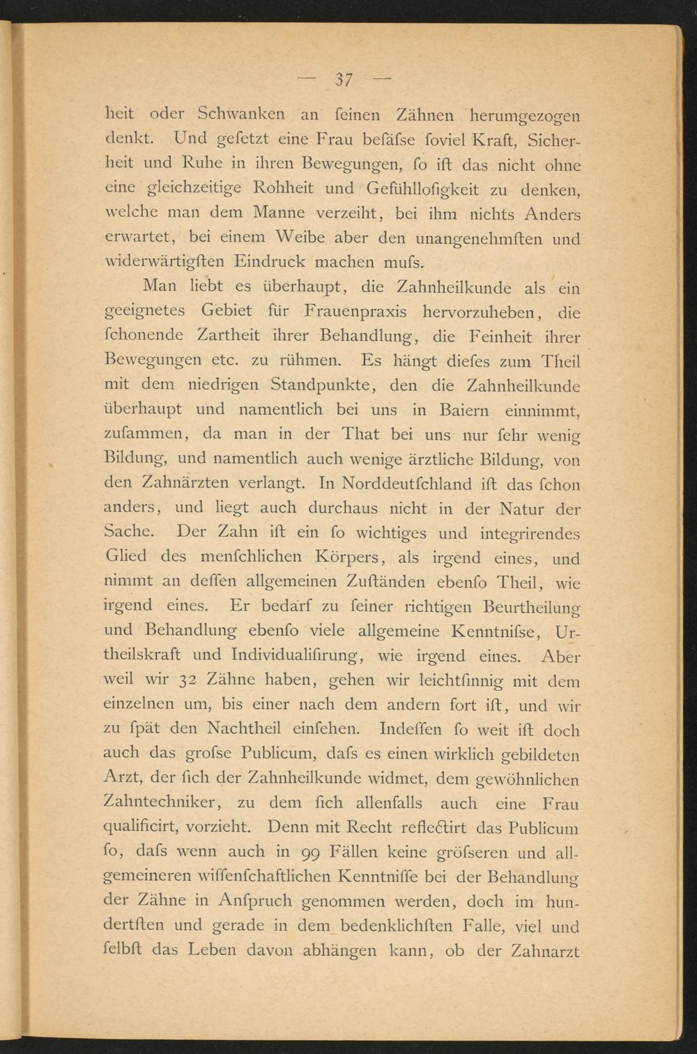 Man liebt es überhaupt, die Zahnheilkunde als ein geeignetes Gebiet für Frauenpraxis hervorzuheben, die fchonende Zartheit ihrer Behandlung, die Feinheit ihrer Bewegungen etc. zu rühmen. Es hängt diefes zum Tlieil mit dem niedrigen Standpunkte, den die Zahnheilkunde überhaupt und namentlich bei uns in Baiern einnimmt, zufammen, da man in der That bei uns nur fehr wenig Bildung, und namentlich auch wenige ärztliche Bildung, von den Zahnärzten verlangt. In Norddeutfchland ift das fchon anders, und liegt auch durchaus nicht in der Natur der Sache. Der Zahn ift ein fo wichtiges und integrirendes Glied des menfchlichen Körpers, als irgend eines, und nimmt an deffen allgemeinen Zuftänden ebenfo Theil, wie irgend eines. Er bedarf zu feiner richtigen Beurtheilung und Behandlung ebenfo viele allgemeine Kenntnifse, Ur- theilskraft und Individualifirung, wie irgend eines. Aber weil wir 32 Zähne haben, gehen wir leichtfinnig mit dem einzelnen um, bis einer nach dem andern fort ift, und wir zu fpät den Nachtheil einfehen. Indeffen fo weit ift doch auch das grofse Publicum, dafs es einen wirklich gebildeten Arzt, der fich der Zahnheilkunde widmet, dem gewöhnlichen Zahntechniker, zu dem (ich allenfalls auch eine Frau qualificärt, vorzieht. Denn mit Recht refleölirt das Publicum fo, dafs wenn auch in 99 Fällen keine gröfseren und allgemeineren wiffenfchaftlichen Kenntniffe bei der Behandlung der Zähne in Anfpruch genommen werden, doch im hun- dertften und gerade in dem bedenklichften Falle, viel und felbft das Leben davon abhängen kann, ob der Zahnarzt
