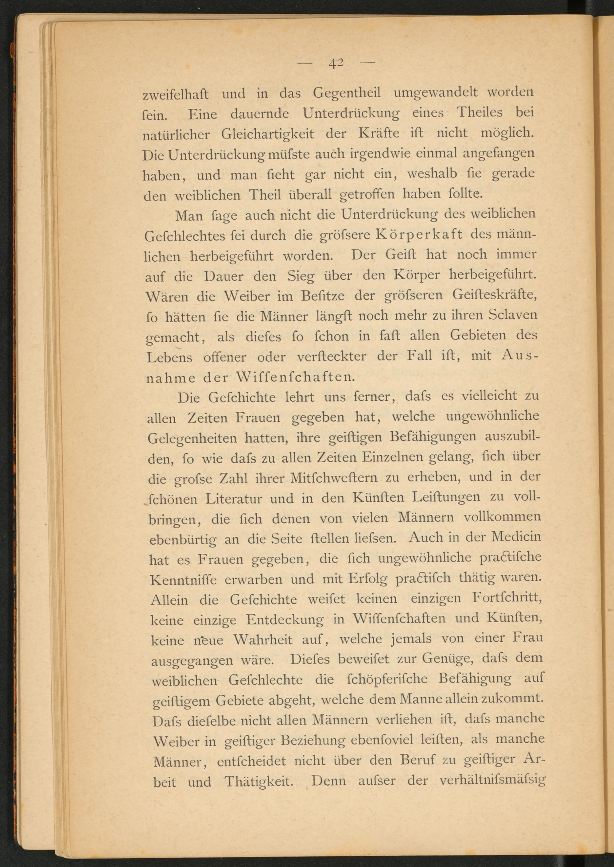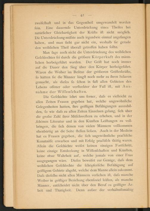 Man fage auch nicht die Unterdrückung des weiblichen Gefchlechtes fei durch die gröfsere Körperhaft des männlichen herbeigeführt worden. Der Geift hat noch immer auf die Dauer den Sieg über den Körper herbeigeführt. Wären die Weiber im Befitze der gröfseren Geifteskräfte, fo hätten fie die Männer längft noch mehr zu ihren Sclaven gemacht, als diefes fo fchon in faft allen Gebieten des Lebens offener oder verfteckter der Fall ift, mit Ausnahme der Wiffenfchaften.
