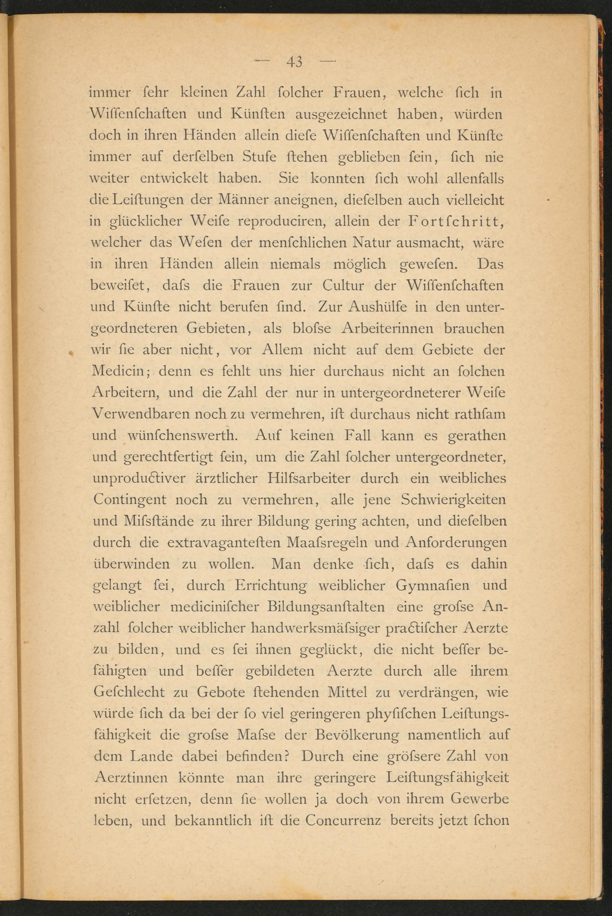 immer fehr kleinen Zahl folcher Frauen, welche fich in Wiffenfchaften und Künden ausgezeichnet haben, würden doch in ihren Händen allein diefe Wiffenfchaften und Künfte immer auf derfelben Stufe ftehen geblieben fein, fich nie weiter entwickelt haben. Sie konnten fich wohl allenfalls die Leiftungen der Männer aneignen, diefelben auch vielleicht in glücklicher Weife reproduciren, allein der Fortfehritt, welcher das Wefen der menfchlichen Natur ausmacht, wäre in ihren Händen allein niemals möglich gewefen. Das beweifet, dafs die Frauen zur Cultur der Wiffenfchaften und Künfte nicht berufen find. Zur Aushülfe in den untergeordneteren Gebieten, als blofse Arbeiterinnen brauchen wir fie aber nicht, vor Allem nicht auf dem Gebiete der Medicin; denn es fehlt uns hier durchaus nicht an folchen Arbeitern, und die Zahl der nur in untergeordneterer Weife Verwendbaren noch zu vermehren, ift durchaus nicht rathfam und wünfehenswerth. Auf keinen Fall kann es gerathen und gerechtfertigt fein, um die Zahl folcher untergeordneter, unprodudtiver ärztlicher Hilfsarbeiter durch ein weibliches Contingent noch zu vermehren, alle jene Schwierigkeiten und Mifsftände zu ihrer Bildung gering achten, und diefelben durch die extravaganteren Maafsregeln und Anforderungen überwinden zu wollen. Man denke fich, dafs es dahin gelangt fei, durch Errichtung weiblicher Gymnafien und weiblicher medicinifcher Bildungsanftalten eine grofse Anzahl folcher weiblicher handwerksmäfsiger pradtifcher Aerzte zu bilden, und es fei ihnen geglückt, die nicht beffer befähigten und beffer gebildeten Aerzte durch alle ihrem Gefchlecht zu Gebote flehenden Mittel zu verdrängen, wie würde fich da bei der fo viel geringeren phyfifchen Leiftungs- fähigkeit die grofse Mafse der Bevölkerung namentlich auf dem Lande dabei befinden? Durch eine gröfsere Zahl von Aerztinnen könnte man ihre geringere Leiftungsfähigkeit nicht erfetzen, denn fie wollen ja doch von ihrem Gewerbe leben, und bekanntlich ift die Concurrenz bereits jetzt fchon