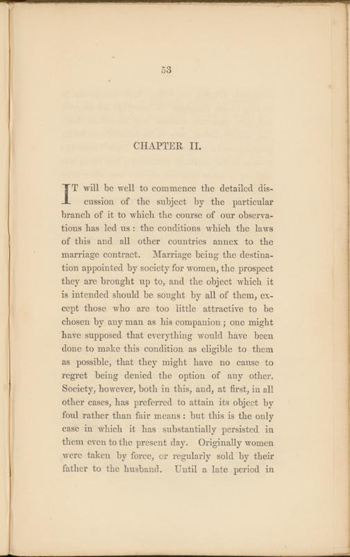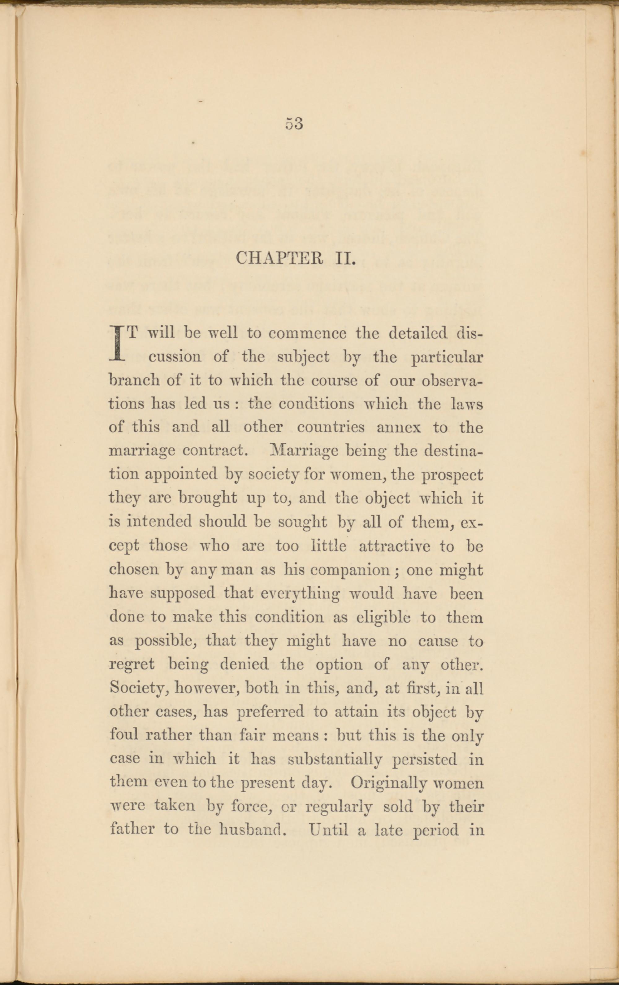 I T will be well to commence the detailed discussion of the subject by the particular branch of it to which the course of our observations has led us : the conditions which the laws of this and all other countries annex to the marriage contract. Marriage being the destination appointed by society for women, the prospect they are brought up to, and the object which it is intended should be sought by all of them, except those who are too little attractive to be chosen by any man as his companion; one might have supposed that everything would have been done to make this condition as eligible to them as possible, that they might have no cause to regret being denied the option of any other. Society, however, both in this, and, at first, in all other cases, has preferred to attain its object by foul rather than fair means : but this is the only case in which it has substantially persisted in them even to the present day. Originally women were taken by force, or regularly sold by their father to the husband. Until a late period in