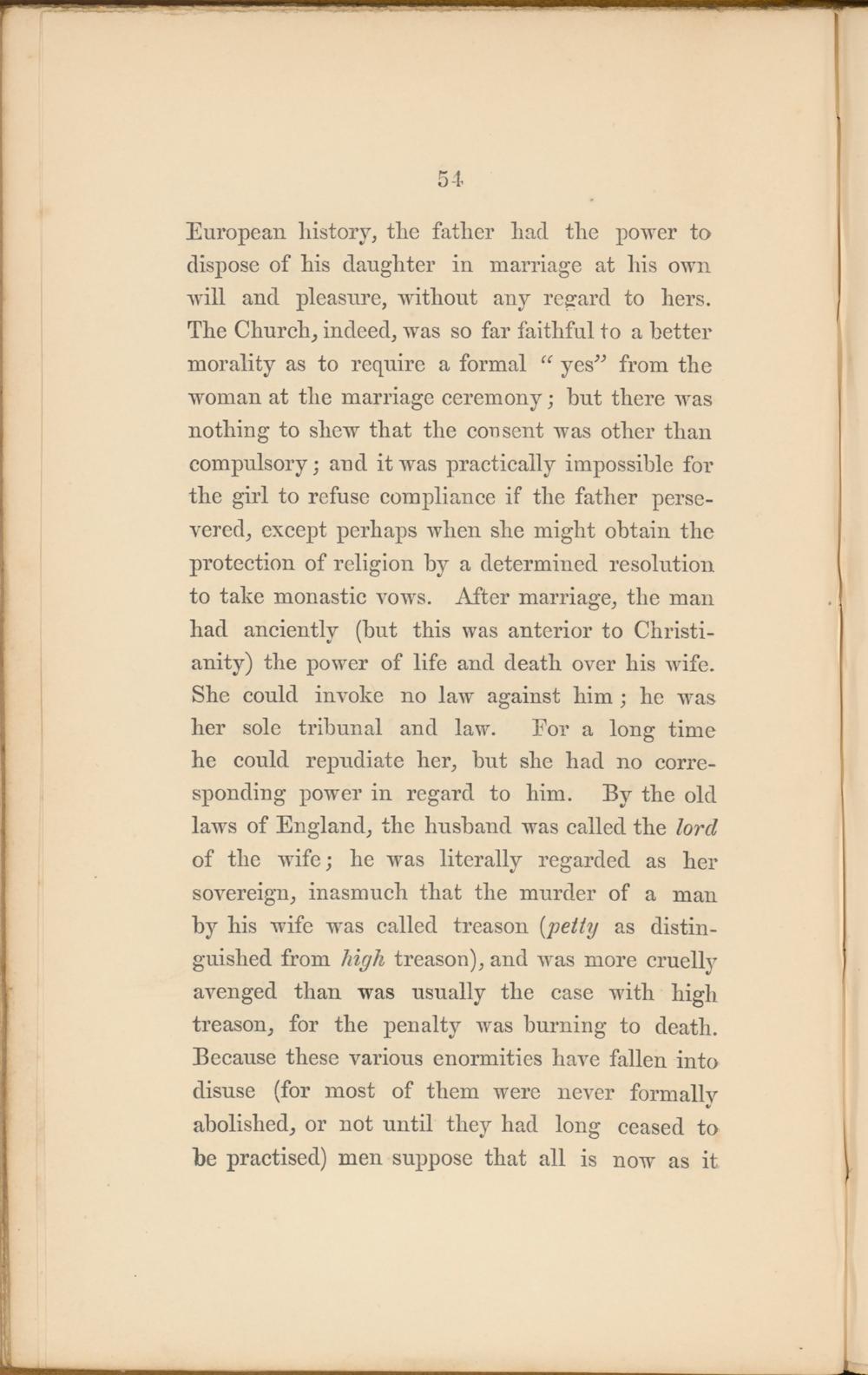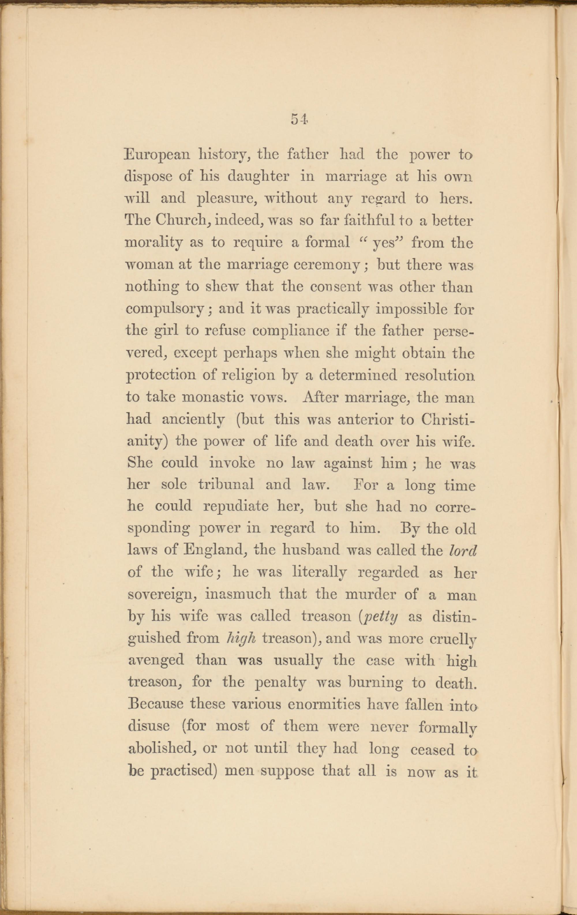European history, the father had the power to dispose of his daughter in marriage at his own will and pleasure, without any regard to hers. The Church, indeed, was so far faithful to a better morality as to require a formal “ yes'’ - ’ from the woman at the marriage ceremony; but there was nothing to shew that the consent was other than compulsory; and it was practically impossible for the girl to refuse compliance if the father persevered, except perhaps when she might obtain the protection of religion by a determined resolution to take monastic vows. After marriage, the man had anciently (but this was anterior to Christianity) the power of life and death over his wife. She could invoke no law against him ; he was her sole tribunal and law. Eor a long time he could repudiate her, but she had no corresponding power in regard to him. By the old laws of England, the husband was called the lord of the wife; he was literally regarded as her sovereign, inasmuch that the murder of a man by his wife was called treason (petty as distinguished from high treason), and was more cruelly avenged than was usually the case with high treason, for the penalty was burning to death. Because these various enormities have fallen into disuse (for most of them were never formally abolished, or not until they had long ceased to be practised) men suppose that all is now as it