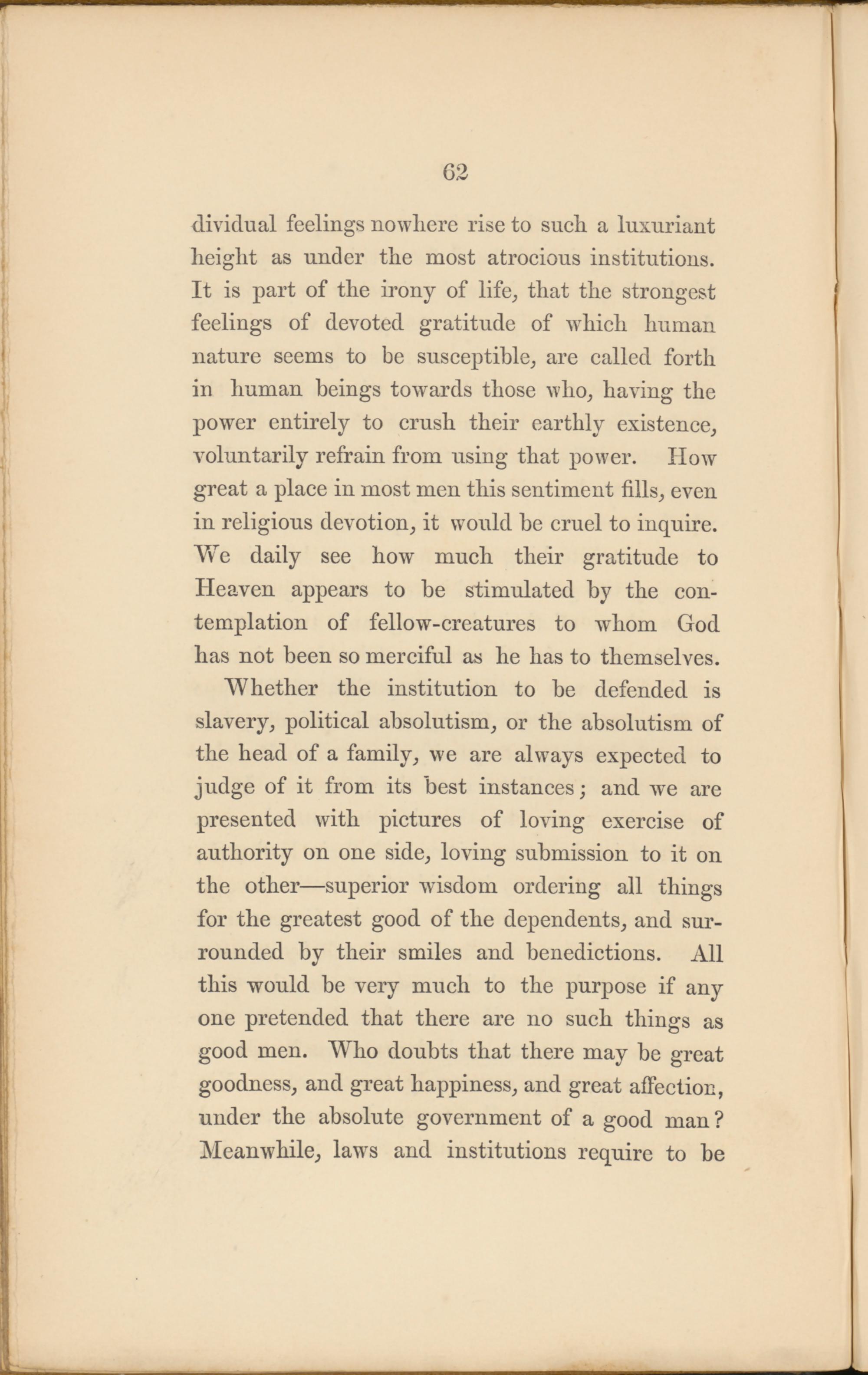 Whether the institution to be defended is slavery, political absolutism, or the absolutism of the head of a family, we are always expected to judge of it from its best instances; and we are presented with pictures of loving exercise of authority on one side, loving submission to it on the other—superior wisdom ordering all things for the greatest good of the dependents, and surrounded by their smiles and benedictions. All this would be very much to the purpose if any one pretended that there are no such things as good men. Who doubts that there may be great goodness, and great happiness, and great affection, under the absolute government of a good man? Meanwhile, law r s and institutions require to be