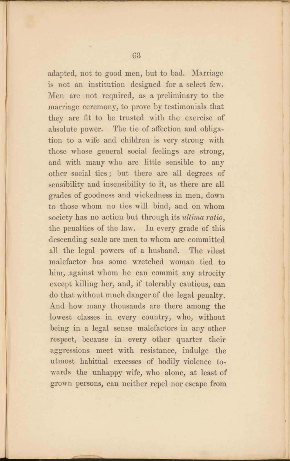 adapted, not to good men, but to bad. Marriage is not an institution designed for a select few. Men are not required, as a preliminary to tbe marriage ceremony, to prove by testimonials that they are fit to be trusted with the exercise of absolute power. The tie of affection and obligation to a wife and children is very strong with those whose general social feelings are strong, and with many who are little sensible to any other social tics ; but there are all degrees of sensibility and insensibility to it, as there arc all grades of goodness and wickedness in men, down to those whom no ties will bind, and on whom society has no action but through its ultima ratio , the penalties of the law. In every grade of this descending scale are men to whom are committed all the legal powers of a husband. The vilest malefactor has some wretched woman tied to him, .against whom he can commit any atrocity except killing her, and, if tolerably cautious, can do that without much danger of the legal penalty. And how many thousands are there among the lowest classes in every country, who, without being in a legal sense malefactors in any other respect, because in every other quarter their aggressions meet with resistance, indulge the utmost habitual excesses of bodily violence towards the unhappy wife, who alone, at least of grown persons, can neither repel nor escape from