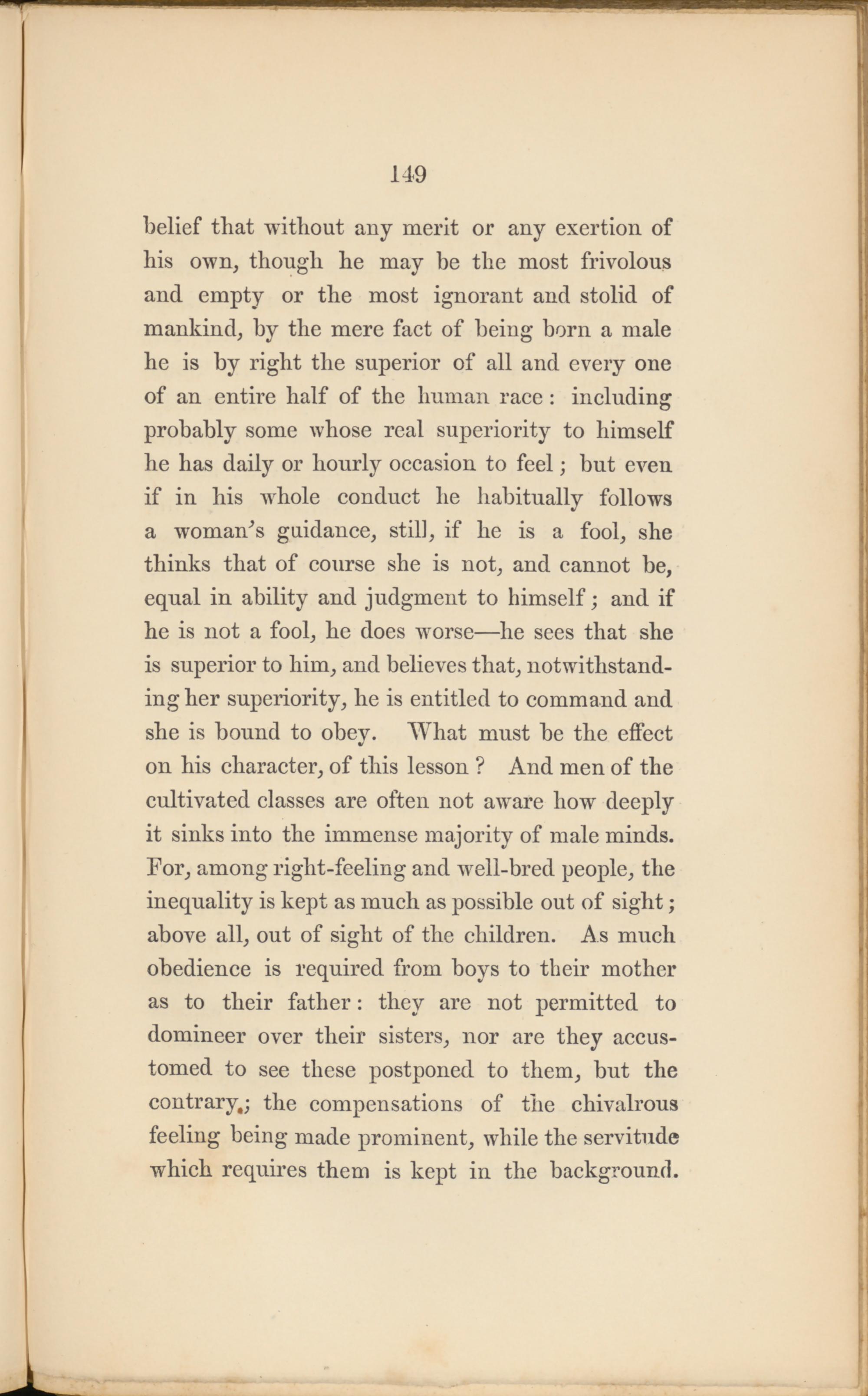 belief that without any merit or any exertion of his own, though he may be the most frivolous and empty or the most ignorant and stolid of mankind, by the mere fact of being born a male he is by right the superior of all and every one of an entire half of the human race : including probably some whose real superiority to himself he has daily or hourly occasion to feel; but even if in his whole conduct he habitually follows a woman’s guidance, still, if he is a fool, she thinks that of course she is not, and cannot be, equal in ability and judgment to himself; and if he is not a fool, he does worse—he sees that she is superior to him, and believes that, notwithstanding her superiority, he is entitled to command and she is bound to obey. What must be the effect on his character, of this lesson ? And men of the cultivated classes are often not aware how deeply it sinks into the immense majority of male minds. For, among right-feeling and well-bred people, the inequality is kept as much as possible out of sight ; above all, out of sight of the children. As much obedience is required from boys to their mother as to their father: they are not permitted to domineer over their sisters, nor are they accustomed to see these postponed to them, but the contrary,; the compensations of the chivalrous feeling being made prominent, while the servitude which requires them is kept in the background.