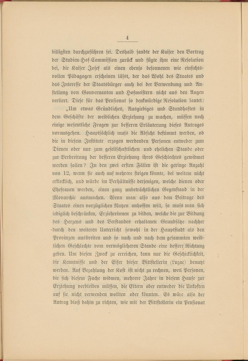 billigsten durchzuführen sei. Deshalb sandte der Kaiser den Vortrag der Studien-Hof-Commission zurück und fügte ihm eine Resolution bei, die Kaiser Joses als einen ebenso besonnenen wie einsichtsvollen Pädagogen erscheinen lässt, der das Wohl des Staates und das Interesse der Staatsbürger auch bei der Verwendung und Anstellung von Gouvernanten und Hofmeistern nicht aus den Augen verliert. Diese für das Pensionat so denkwürdige Resolution lautet:
