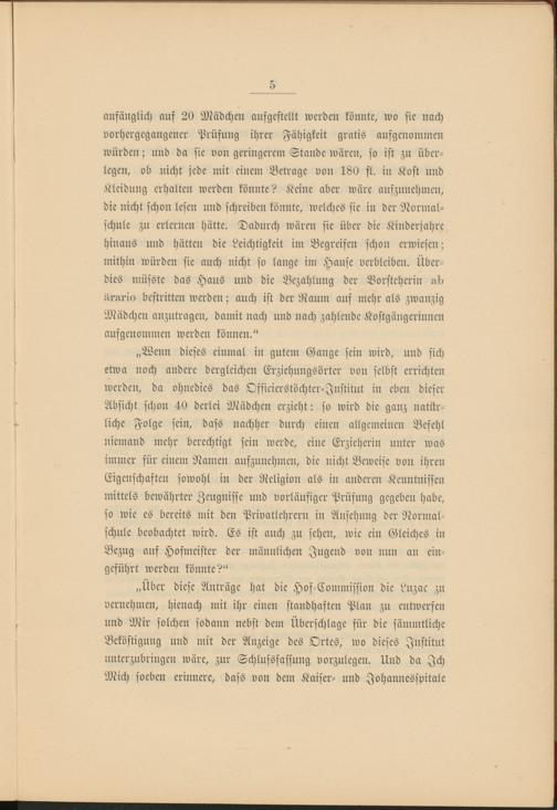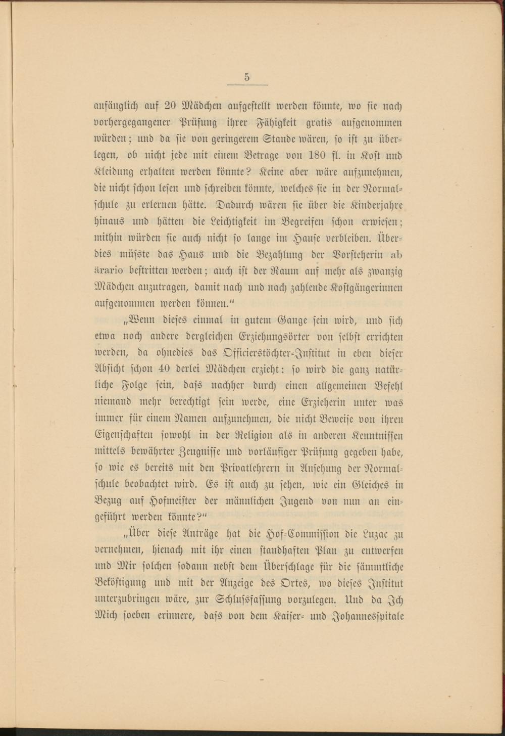„Wenn dieses einmal in gutem Gange sein wird, und sich etwa noch andere dergleichen Erziehungsörter von selbst errichten werden, da ohnedies das Officierstöchter-Jnstitut in eben dieser Absicht schon 40 derlei Mädchen erzieht: so wird die ganz natürliche Folge sein, dass nachher durch einen allgemeinen Befehl niemand mehr berechtigt sein werde, eine Erzieherin unter was immer für einem Namen aufzunehmen, die nicht Beweise von ihren Eigenschaften sowohl in der Religion als in anderen Kenntnissen mittels bewährter Zeugnisse und vorläufiger Prüfung gegeben habe, so wie es bereits mit den Privattehrern in Ansehung der Normalschule beobachtet wird. Es ist auch zu sehen, wie ein Gleiches in Bezug auf Hofmeister der männlichen Jugend von nun an eingeführt werden könnte?"