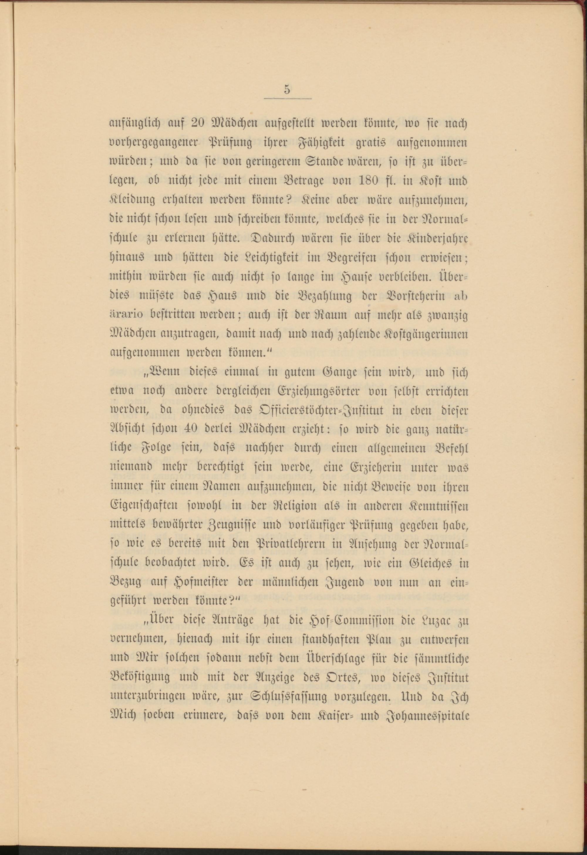 „Über diese Anträge hat die Hof-Commission die Luzac zu vernehmen, hienach mit ihr einen standhaften Plan zu entwerfen und Mir solchen sodann nebst dem Überschlage für die sämmtliche Beköstigung und mit der Anzeige des Ortes, wo dieses Institut unterzubringen wäre, zur Schlussfassung vorzulegen. Und da Ich Mich soeben erinnere, dass von dem Kaiser- und Johannesspitale