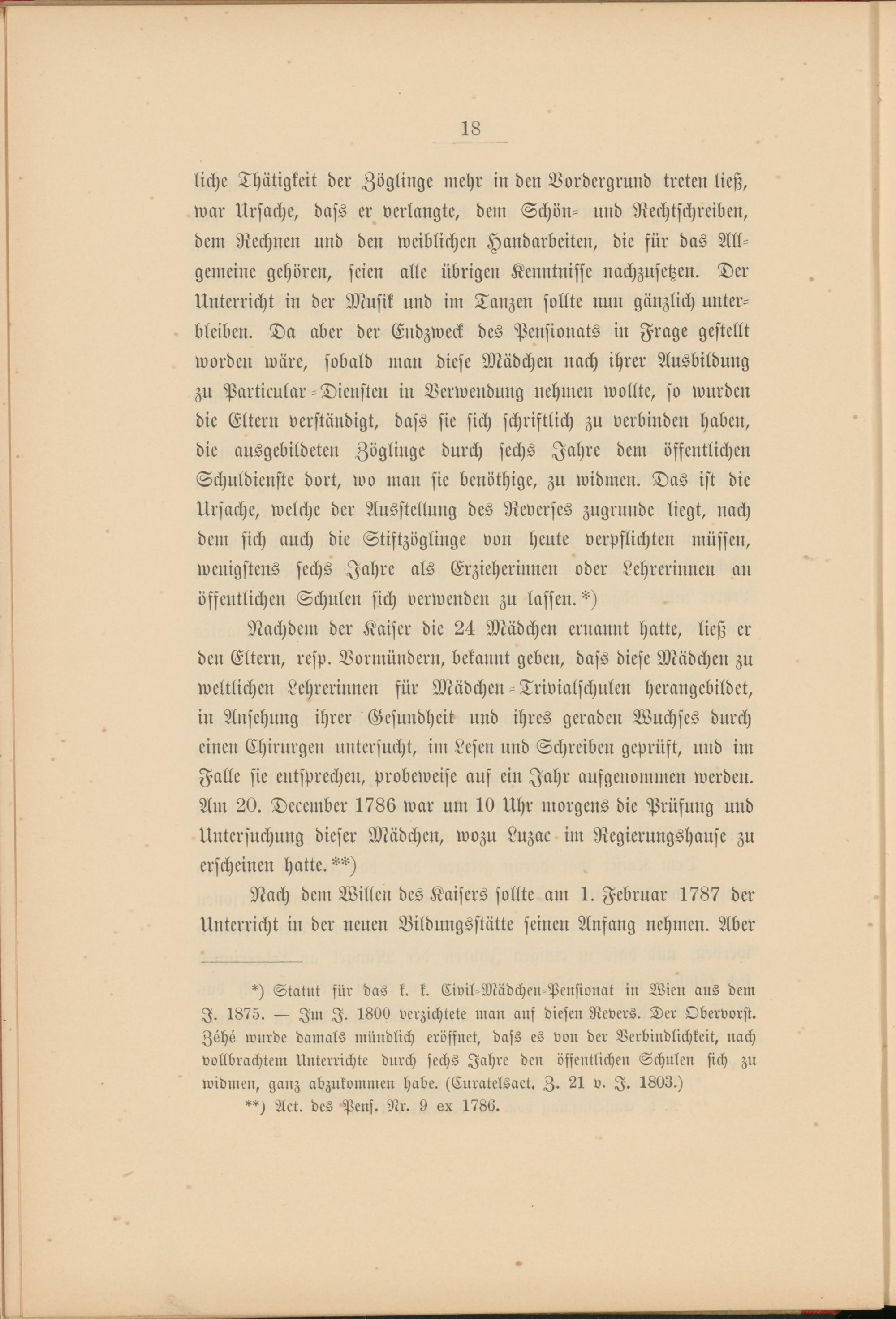 *) Statut für das k. k. Civil-Mädchen-Peusionat in Wien aus dem I. 1875. — Im I. 1800 verzichtete man auf diesen Revers. Der Obervorst. Zoho wurde damals mündlich eröffnet, dass es von der Verbindlichkeit, nach vollbrachtem Unterrichte durch sechs Jahre den öffentlichen Schulen sich zu widmen, ganz abzukommen habe. (Curatelsact. Z. 21 v. I. 1803.)