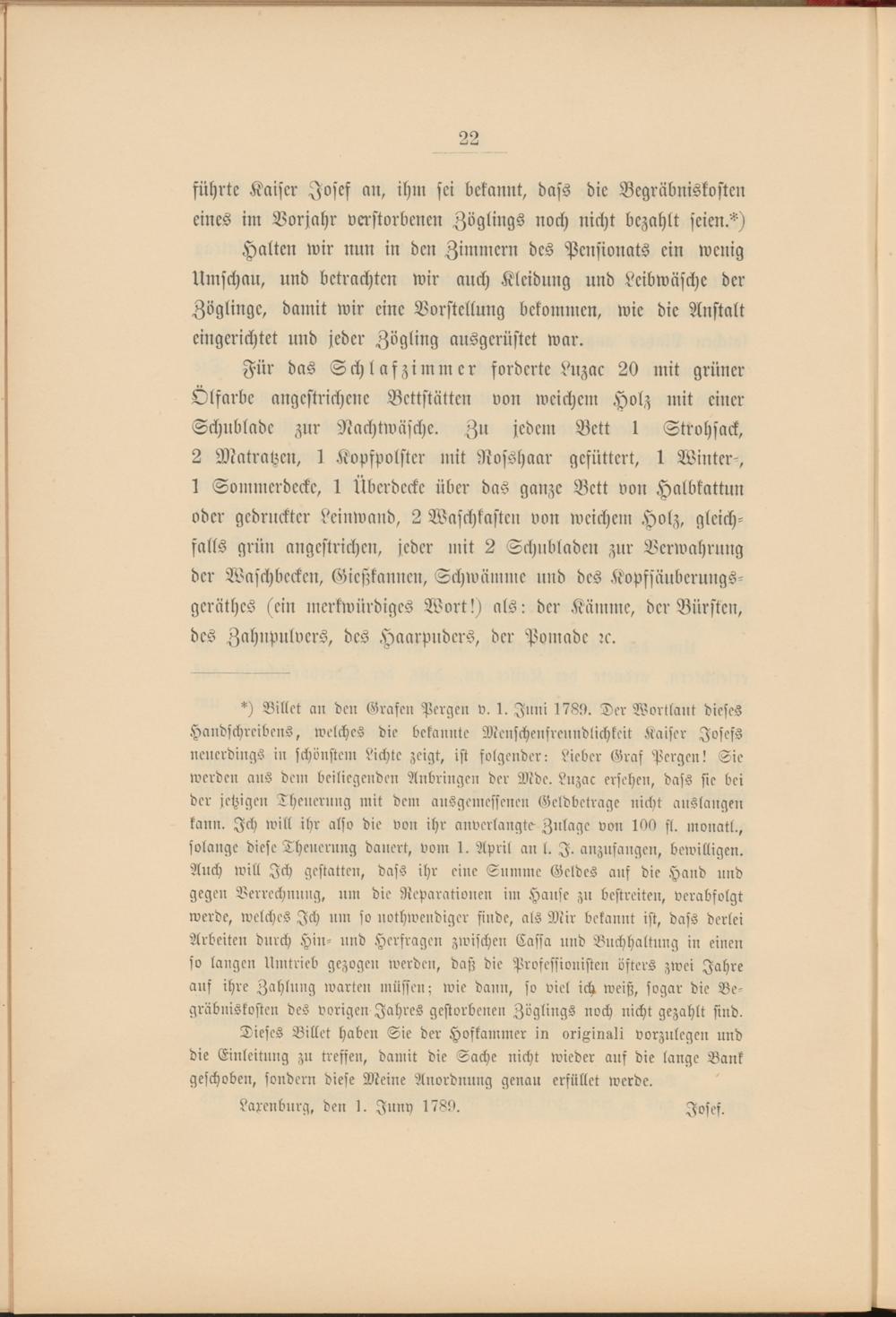 *) Billet an den Grafen Pergen v. 1. Jnni 1789. Der Wortlaut dieses Handschreibens, welches die bekannte Menschenfreundlichkeit Kaiser Josefs neuerdings in schönstem Richte zeigt, ist folgender: Lieber Graf Pergen! Sie werden aus dem beiliegenden Anbringen der Mdc. Lnzac ersehen, dass sie bei der jetzigen Theuerung mit dem ausgemessenen Geldbeträge nicht auslangen kann. Ich will ihr also die von ihr unverlangte Zulage von 100 fl. monatl., solange diese Theuerung dauert, vom 1. April an t. I. anzufangen, bewilligen. Auch will Ich gestatten, dass ihr eine Summe Geldes auf die Hand und gegen Verrechnung, um die Reparationen im Hanse zu bcstreiten, verabfolgt werde, welches Ich um so nothwendiger finde, als Mir bekannt ist, dass derlei Arbeiten durch Hin- und Herfragen zwischen Cassa und Buchhaltung in einen so langen Umtrieb gezogen werden, daß die Professiouisten öfters zwei Jahre auf ihre Zahlung warten müssen; wie dann, so viel ich weiß, sogar die Begräbniskosten des vorigen Jahres gestorbenen Zöglings noch nicht gezahlt sind.