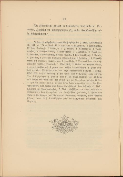 *) Anders ausgestattet waren die Zöglinge im I. 1815. Die Copia aä Nr. 133, rrä 175 ex Novb. 1815 führt an: 6 Taghemden, 3 Nachthemden, 12 Paar Strümpfe, 6 Schürzen, 6 Halstücher, 4 Nachthauben, 4 Nachtleibchen, 3 Barchent-Röcke, 3 leinwandene, 6 Handtücher, 6 Servietten, 6 Bettücher, 3 Polsterziechen, 4 Paar Schuhe, 4 Paar Handschuhe, 1 Parasol, 4 Häubchen, 1 Strohhut, 2 Binden, 3 Chemisetten, 3 Halstücher, 1 Schweißkamm mit Bürstet, 1 Tapierkamm, 1 Zahnbürste, 2 Sommerkleider von roth- gestreifter englischer Leinwand, 1 Winterkleid, 2 Kleider von weißem Perkal, 1 großes Umhängtuch, 1 graues und weißes Schnnrleibchen, 1 grüne Bettstatt mit einer Schublade und dein dazu erforderlichen Bettzeug, 1 Silberlöffel. Die äußere Kleidung ist für Stift- und Kostzöglinge ganz conform. Den Stiftzöglingen ist gestattet, dass sie bei ihrem Austritte ihre Kleidung und Wäsche mit Ausnahme des Bettes als ihr Eigenthum ansehen dürfen. — Für die Schule wurden sie nach dieser Copia ausgerüstet mit der deutschen Sprachlehre, dein großen und kleinen Katechismus, dem Lesebuche (1 Theil: Anleitung zur Rechtschaffcnheit, 2. Theil: Geschichte des alten und neuen Testamentes), dem Evangelium, dem katechetifchen Handbuche, 3 Theilen von Sulzers Vorübungen, mit Rechentafel, Nechenstein, Bleistiften, einem Büschen Federn, einem Buch Schreibpapier und der französischen Grammatik von Bogtberg.