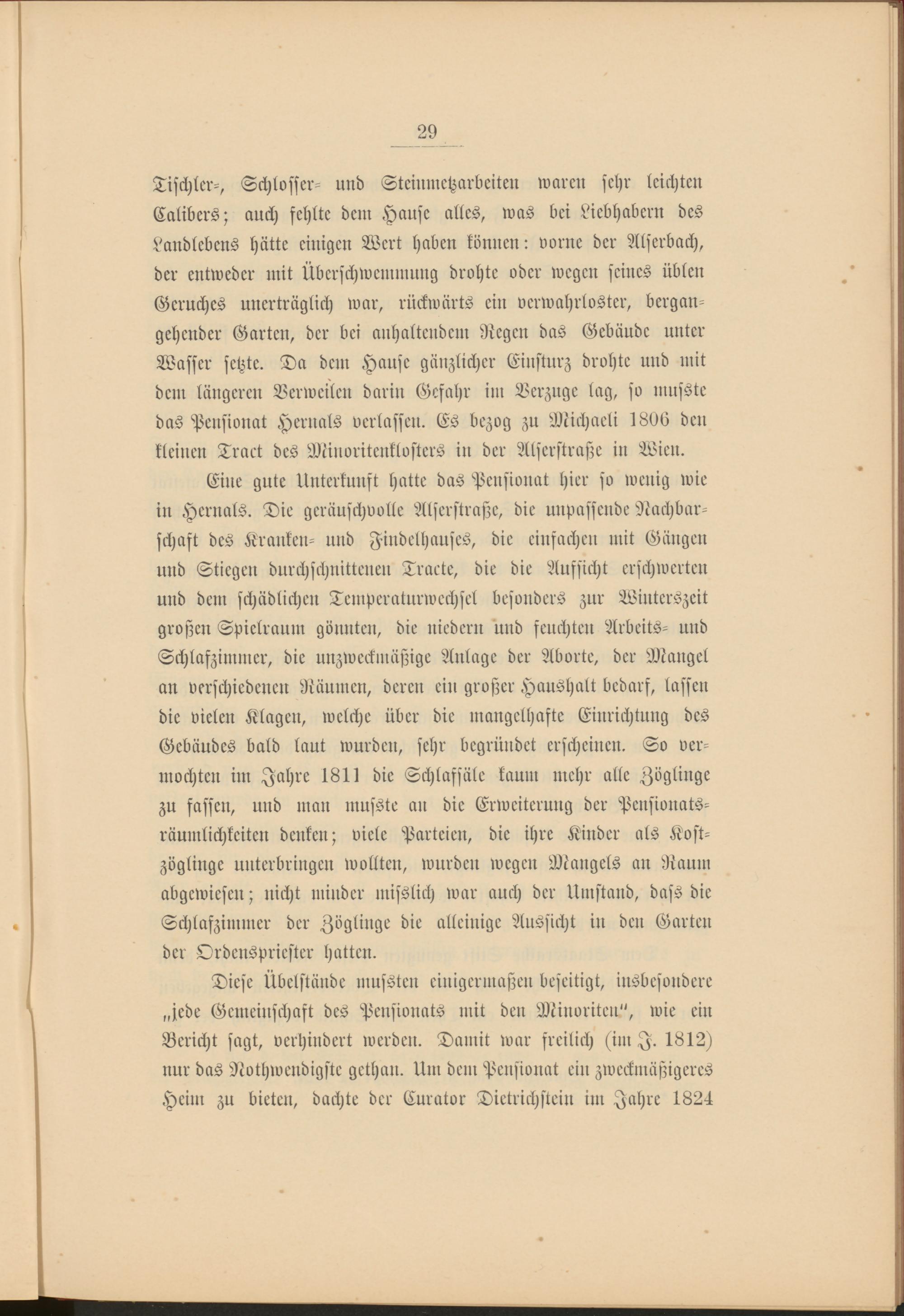 Tischler-, Schlosser- und Steinmctzarbeiten waren sehr leichten Calibers; auch fehlte dem Hause alles, was bei Liebhabern des Landlebens hätte einigen Wert haben können: vorne der Alserbach, der entweder mit Überschwemmung drohte oder wegen seines üblen Geruches unerträglich war, rückwärts ein verwahrloster, bergan- gehender Garten, der bei anhaltendem Regen das Gebäude unter Wasser setzte. Da dem Hause gänzlicher Einsturz drohte und mit dem längeren Verweilen darin Gefahr im Verzüge lag, so musste das Pensionat Hernals verlassen. Es bezog zu Michaeli 1806 den kleinen Traet des Minoriteuklosters in der Alserstraße in Wien.