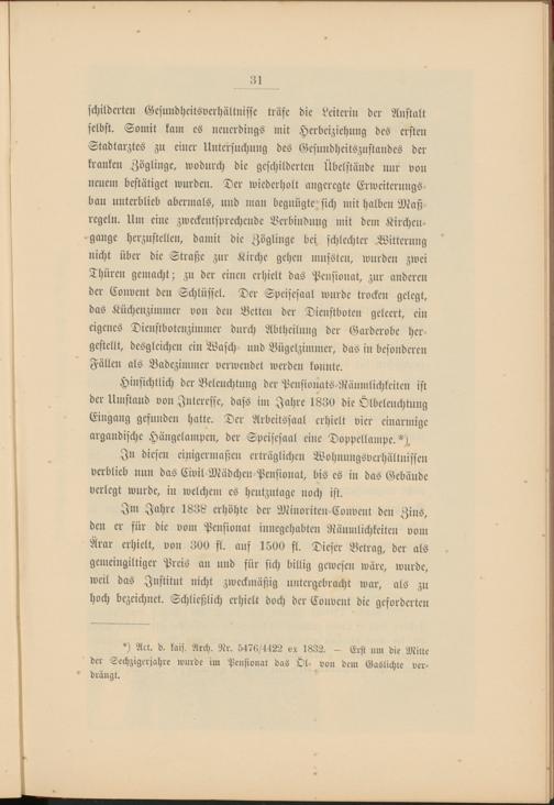 Im Jahre 1838 erhöhte der MinoritemConvent den Zins, den er für die vom Pensionat innegehabten Räumlichkeiten vom Ärar erhielt, von 300 st. auf 1500 fl. Dieser Betrag, der als gemeingiltigcr Preis an und für sich billig gewesen wäre, wurde, weil das Institut nicht zweckmäßig untergebracht war, als zu hoch bezeichnet. Schließlich erhielt doch der Convent die geforderten