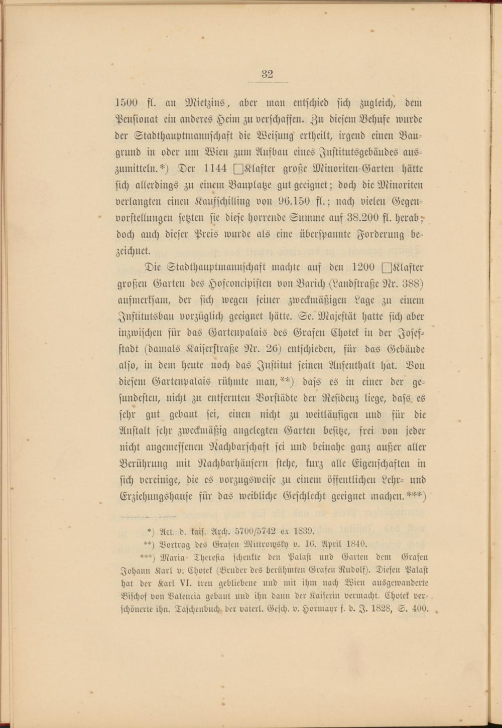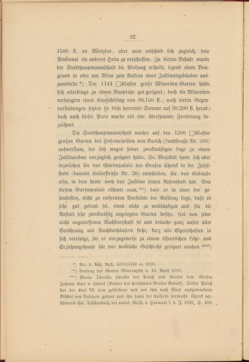 Die Stadthauptmanuschast machte auf den 1200 ^Klafter großen Garten des Hofconeipisten von Barich (Landstraße Nr. 388) aufmerksam, der sich wegen seiner zweckmäßigen Lage zu einem Jnstitutsbau vorzüglich geeignet hätte. Se. Majestät hatte sich aber inzwischen für das Garteupalais des Grafen Chotek in der Josesstadt (damals Kaiserstraße Nr. 20) entschieden, für das Gebäude also, in dem heute noch das Institut seinen Aufenthalt hat. Bon diesem Garteupalais rühmte man,**) dass es in einer der gesundesten, nicht zu entfernten Vorstädte der Residenz liege, dass es sehr gut gebaut sei, einen nicht zu weitläufigen und für die Anstalt sehr zweckmäßig angelegten Garten besitze, frei von jeder nicht angemessenen Nachbarschaft sei und beinahe ganz außer aller Berührung mit Nachbarhäusern stehe, kurz alle Eigenschaften in sich vereinige, die es vorzugsweise zu einem öffentlichen Lehr- und Erziehungshause für das weibliche Geschlecht geeignet machen. ***)