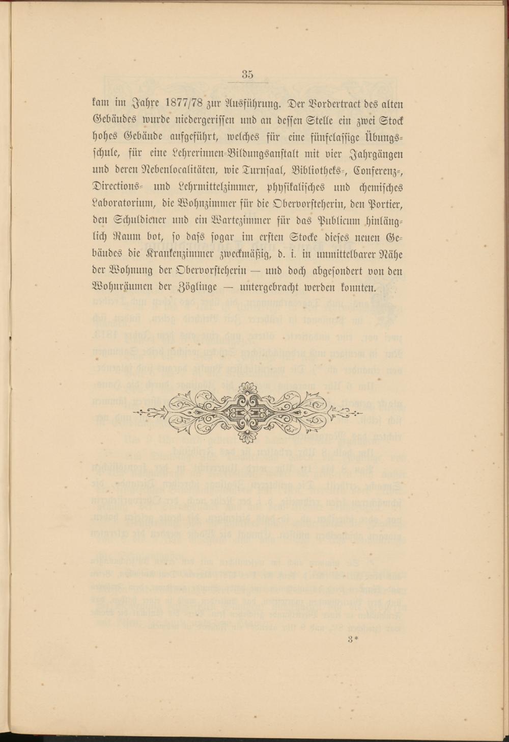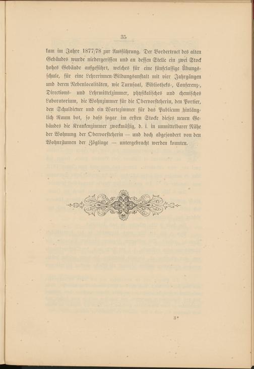 kam im Jahre 1877/78 zur Ausführung. Der Bordertract des alten Gebäudes wurde niedergerissen und an dessen Stelle ein zwei Stock hohes Gebäude aufgeführt, welches für eine fünfclassige Übungsschule, für eine Lehrerinncn-Bildungsanstalt mit vier Jahrgängen und deren Nebenlocalitüten, wie Turnsaal, Bibliotheks-, Conferenz-, Directions- und Lehrmittelzimmcr, physikalisches und chemisches Laboratorium, die Wohnzimmer für die Obervorsteherin, den Portier, den Schuldicner und ein Wartezimmer für das Pnblicum hinlänglich Raum bot, so dass sogar im ersten Stocke dieses neuen Gebäudes die Krankenzimmer zweckmäßig, d. i. in unmittelbarer Nähe der Wohnung der Obervorsteherin — und doch abgesondert von den Wohnräumen der Zöglinge — untergebracht werden konnten.