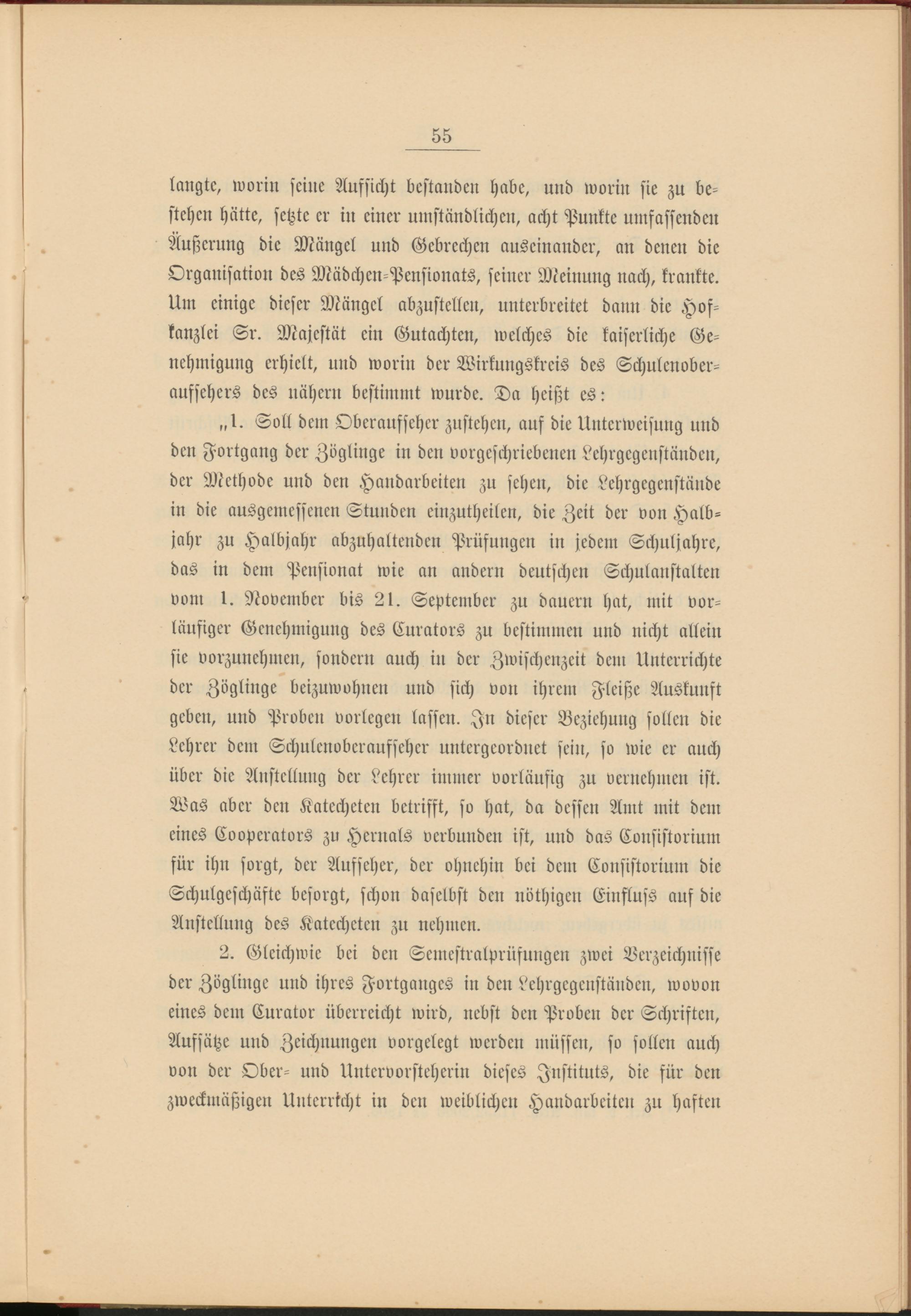 langte, worin seine Aufsicht bestanden habe, und worin sie zu bestehen hätte, setzte er in einer umständlichen, acht Punkte umfassenden Äußerung die Mängel und Gebrechen auseinander, an denen die Organisation des Mädchen-Pensionats, seiner Meinung nach, krankte. Um einige dieser Mängel abzustellen, unterbreitet dann die Hofkanzlei Sr. Majestät ein Gutachten, welches die kaiserliche Genehmigung erhielt, und worin der Wirkungskreis des Schulenober- aufsehers des nähern bestimmt wurde. Da heißt es: