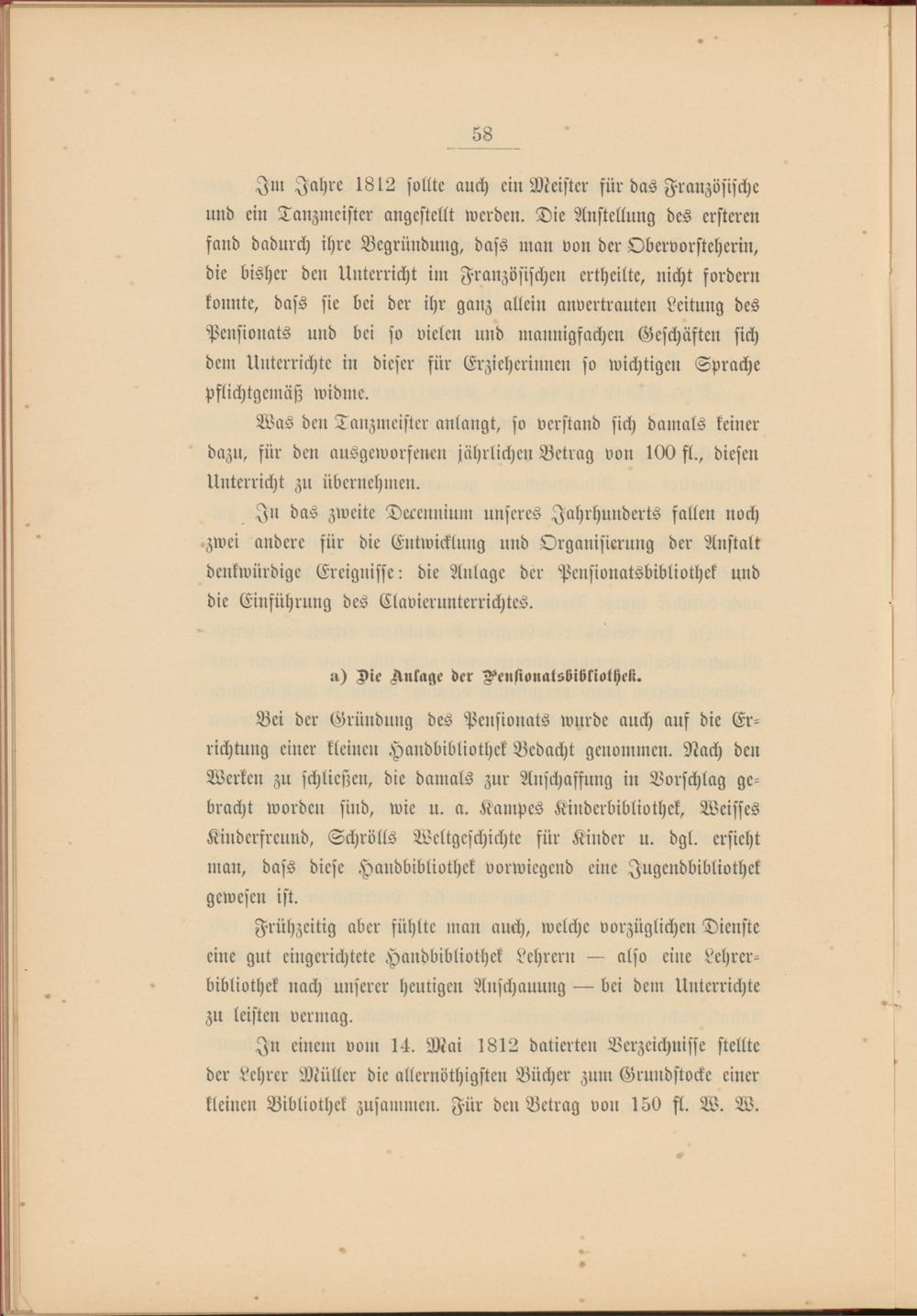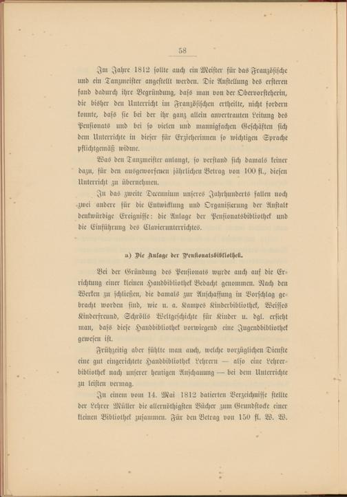 In das zweite Derennium unseres Jahrhunderts fallen noch zwei andere für die Entwicklung und Organisierung der Anstalt denkwürdige Ereignisse: die Anlage der Pensionatsbibliothek und die Einführung des Clavierunterrichtes.