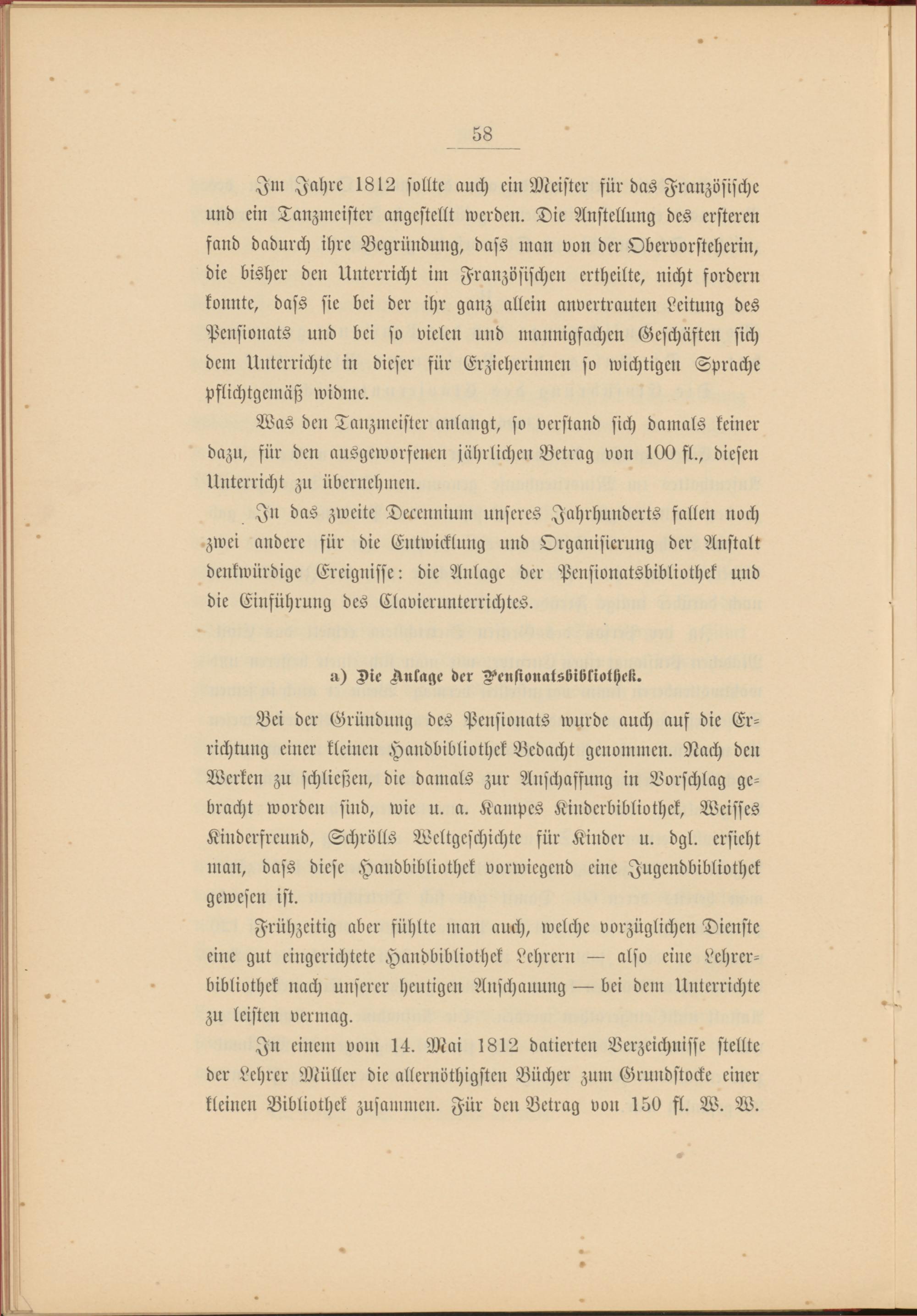 Im Jahre 18 l2 sollte auch ein Meister für das Französische und ein Tanzmcister angestellt werden. Die Anstellung des ersteren fand dadurch ihre Begründung, dass man von der Obervorsteherin, die bisher den Unterricht im Französischen ertheilte, nicht fordern konnte, dass sie bei der ihr ganz allein anvertrauten Leitung des Pensionats und bei so vielen und mannigfachen Geschäften sich dem Unterrichte in dieser für Erzieherinnen so wichtigen Sprache pflichtgemäß widme.