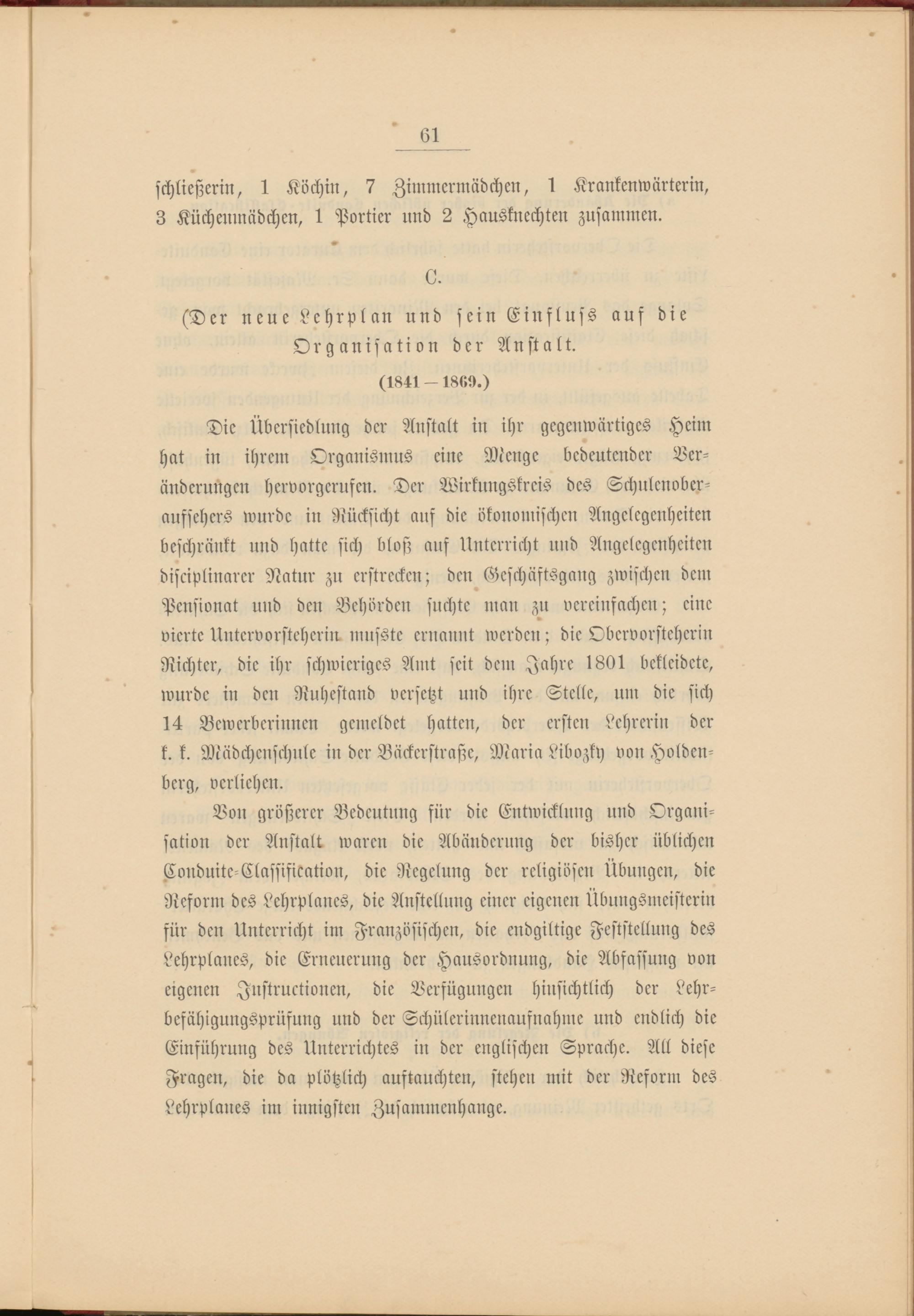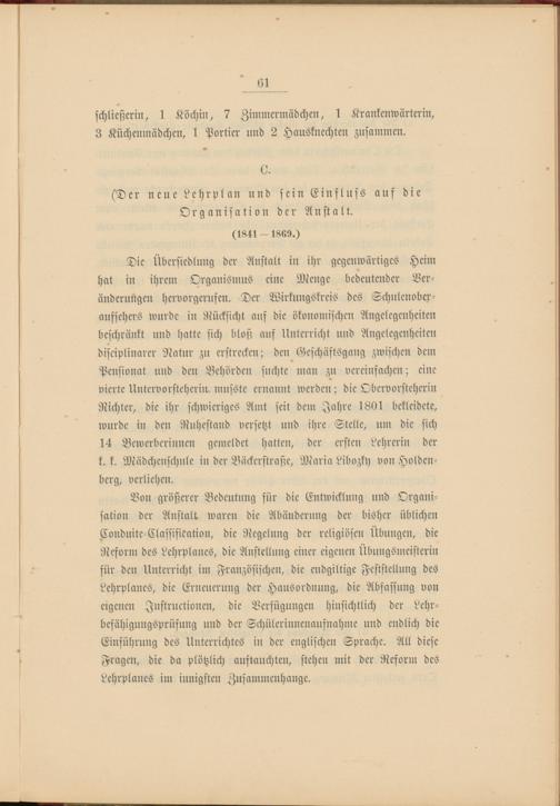 Die Übersiedlung der Anstalt in ihr gegenwärtiges Heim hat in ihrem Organismus eine Menge bedeutender Veränderungen hervorgerufen. Der Wirkungskreis des Schnlenober- aufsehers wurde in Rücksicht auf die ökonomischen Angelegenheiten beschränkt und hatte sich bloß auf Unterricht und Angelegenheiten disciplinarer Natur zu erstrecken; den Geschäftsgang zwischen dem Pensionat und den Behörden suchte man zu vereinfachen; eine vierte Untervorsteherin musste ernannt werden; die Obervorsteherin Richter, die ihr schwieriges Amt seit dem Jahre 1801 bekleidete, wurde in den Ruhestand versetzt und ihre Stelle, um die sich 14 Bewerberinnen gemeldet hatten, der ersten Lehrerin der k. k. Mädchenschule in der Bäckerstraße, Maria Libozky von Holden- berg, verliehen.