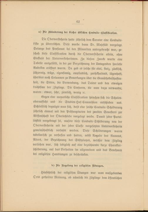 Gegen eine monatliche Classification sprachen sich die Schulen- oberaufsicht und die Studien-Hos-Commission entschieden aus. Schließlich begnügte man sich, dass eine solche Conduite-Schilderung jährlich einmal mit den Prüfungsacten des zweiten Semesters zur Wissenschaft der Oberbehördc vorgelegt werde. Damit jeder Parteilichkeit vorgebeugt sei, musste diese Conduite-Schilderung von der Obervorsteherin mit der jeder Classe vorgesetzten Untervorsteherin gemeinschaftlich verfasst werden. Diese Schilderungen waren tabellarisch zu verfassen und hatten, nebst Angabe des Namens, Alters, der Bezeichnung des Stiftplatzes, welcher dem Zögling verliehen war, sich lediglich auf eine bezeichnende kurze Charakterschilderung, auf das Verhalten im allgemeinen und das Benehmen bei religiösen Handlungen zu beschränken.