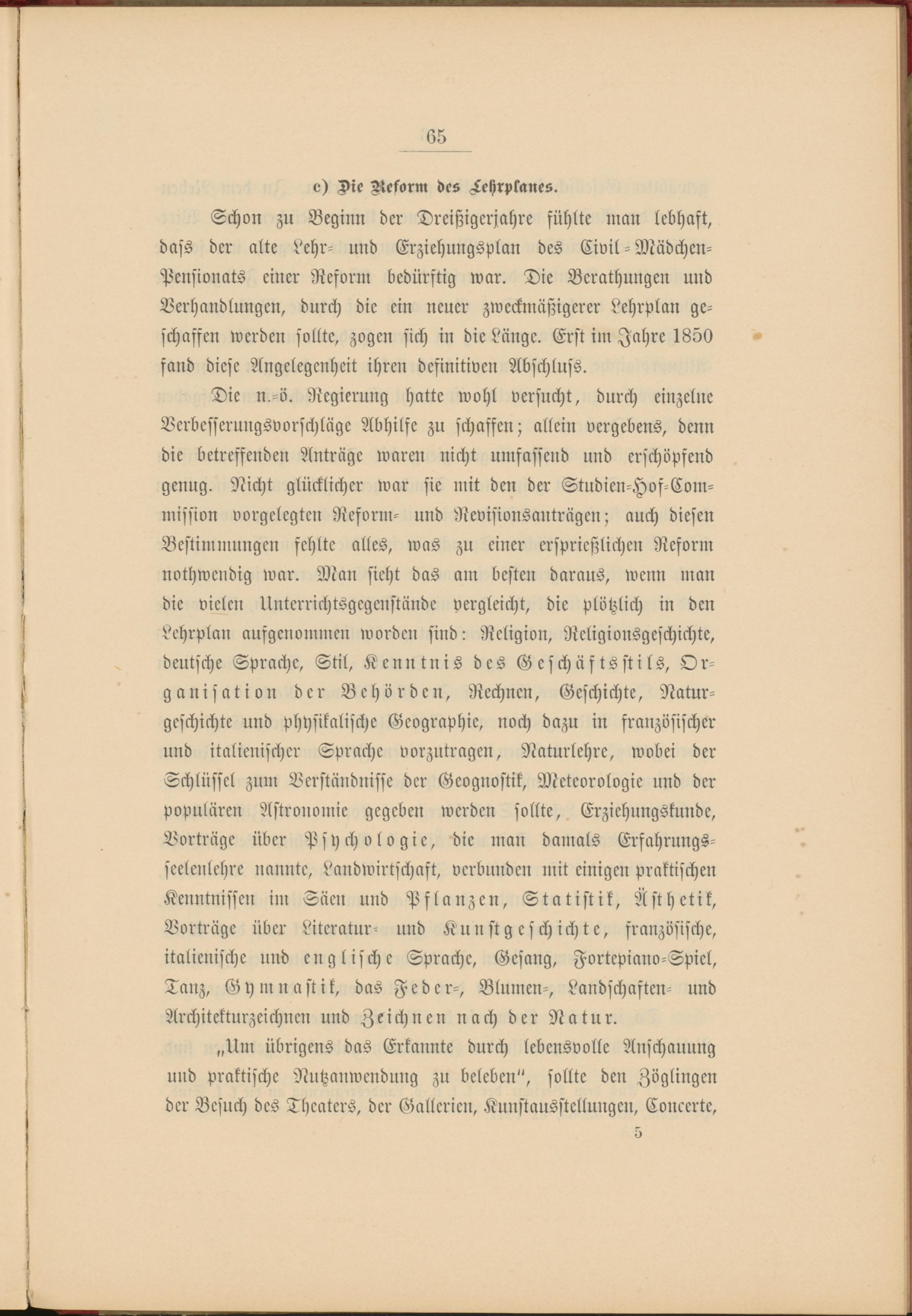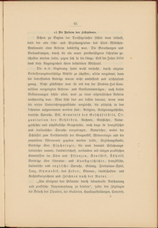 Schon zu Beginn der Dreißigerjahre fühlte man lebhaft, dass der alte Lehr- und Erziehungsplan des Civil - Mädchen- Pensionats einer Reform bedürftig war. Die Berathungen und Verhandlungen, durch die ein neuer zweckmäßigerer Lehrplan ge­schaffen werden sollte, zogen sich in die Länge. Erst im Jahre 1850 fand diese Angelegenheit ihren definitiven Abschluss.