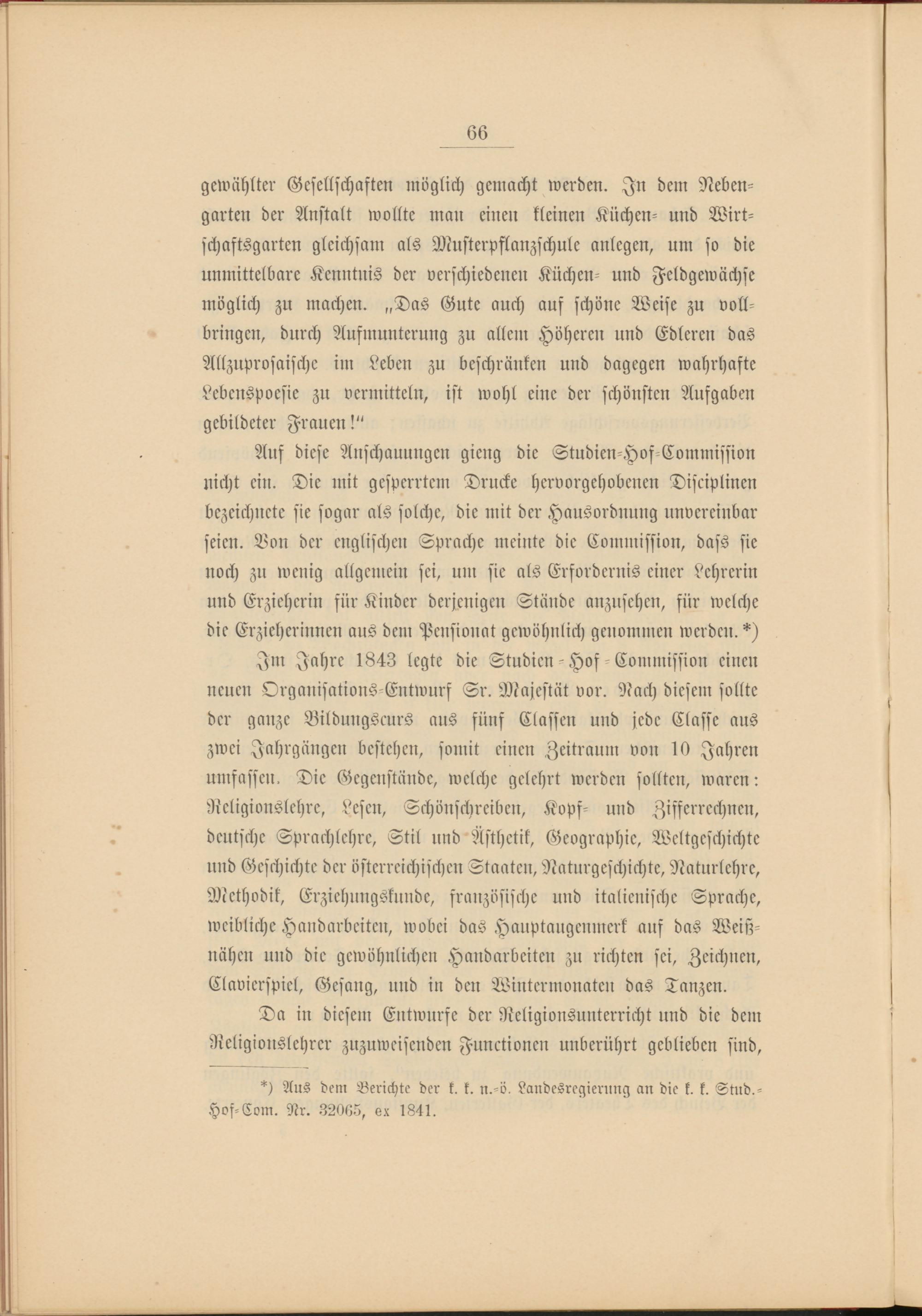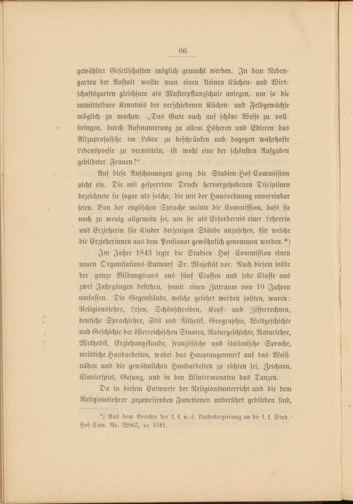 Auf diese Anschauungen gieng die Studien-Hof-Commission nicht ein. Die mit gesperrtem Drucke hervorgehobenen Disciplinen bezeichnete sie sogar als solche, die mit der Hausordnung unvereinbar seien. Von der englischen Sprache meinte die Commission, dass sie noch zu wenig allgemein sei, um sie als Erfordernis einer Lehrerin und Erzieherin für Kinder derjenigen Stünde anzusehen, für welche die Erzieherinnen aus dem Pensionat gewöhnlich genommen werden. *)
