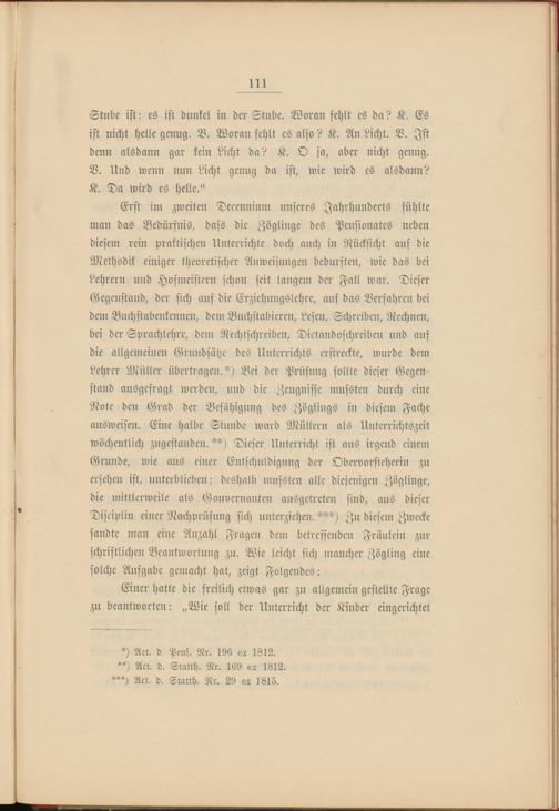 Erst im zweiten Decennium unseres Jahrhunderts fühlte man das Bedürfnis, dass die Zöglinge des Pensionates neben diesem rein praktischen Unterrichte doch auch in Rücksicht auf die Methodik einiger theoretischer Anweisungen bedurften, wie das bei Lehrern und Hofmeistern schon seit langem der Fall war. Dieser Gegenstand, der sich auf die Erzichungslehre, auf das Verfahren bei dem Buchstabeukcnucn, dein Buchstabieren, Lesen, Schreiben, Rechnen, bei der Sprachlehre, dem Rechtschreiben, Dictandoschrciben und auf die allgemeinen Grundsätze des Unterrichts erstreckte, wurde dem Lehrer Müller übertragen.*) Bei der Prüfung sollte dieser Gegen­stand ausgefragt werden, und die Zeugnisse mussten durch eine Note den Grad der Befähigung des Zöglings in diesem Fache ausweisen. Eine halbe Stunde ward Müllern als Unterrichtszeit wöchentlich zugestanden.**) Dieser Unterricht ist aus irgend einem Grunde, wie aus einer Entschuldigung der Obervorsteherin zu ersehen ist, unterblieben; deshalb mussten alle diejenigen Zöglinge, die mittlerweile als Gouvernanten ausgetreten sind, aus dieser Disciplin einer Nachprüfung sich unterziehen. ***) Zu diesem Zwecke sandte man eine Anzahl Fragen dem betreffenden Fräulein zur schriftlichen Beantwortung zu. Wie leicht sich mancher Zögling eine solche Aufgabe gemacht hat, zeigt Folgendes: