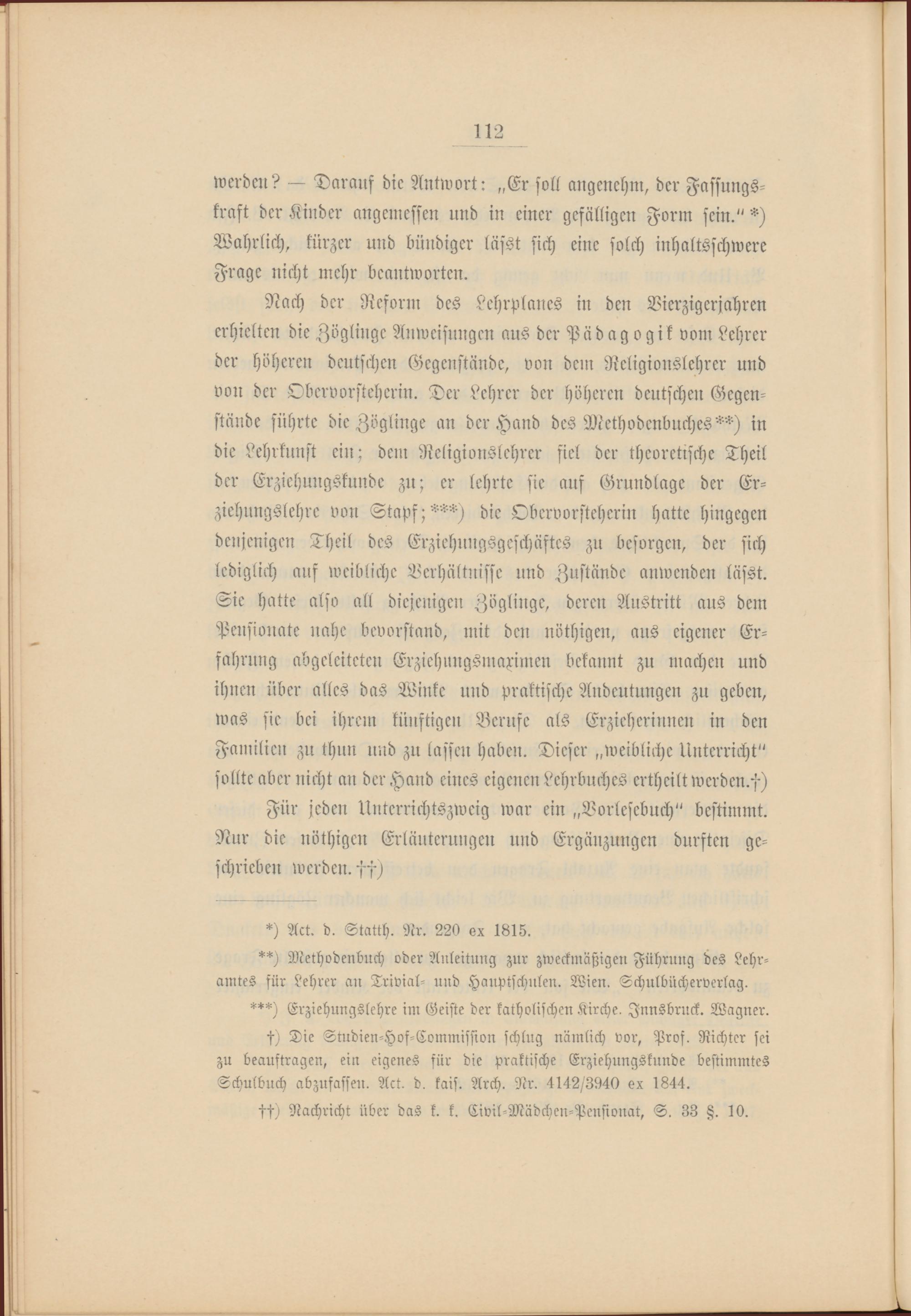Nach der Reform des Lehrplanes in den Vierzigerjahren erhielten die Zöglinge Anweisungen aus derPädagogik vom Lehrer der höheren deutschen Gegenstände, von dem Neligionslehrer und von der Obcrvorsteherin. Der Lehrer der höheren deutschen Gegenstände führte die Zöglinge an der Hand des Methodcnbuches**) in die Lehrknnst ein; dem Neligionslehrer siel der theorcüsche Theil der Erziehungskunde zu; er lehrte sie auf Grundlage der Er- ziehnngslehrc von Stapf;***) die Obcrvorsteherin hatte hingegen denjenigen Theil des Erziehungsgeschäftes zn besorgen, der sich lediglich auf weibliche Verhältnisse und Zustände anwenden lässt. Sie hatte also all diejenigen Zöglinge, deren Austritt aus dem Pensionate nahe bevorstand, mit den nöthigen, aus eigener Erfahrung abgeleiteten Erziehungsmaximen bekannt zu machen und ihnen über alles das Winke und praktische Andeutungen zn geben, was sie bei ihrem künftigen Berufe als Erzieherinnen in den Familien zu thun nnd zu lassen haben. Dieser „weibliche Unterricht" sollte aber nicht an der Hand eines eigenen Lehrbuches ertheilt werden.ch)